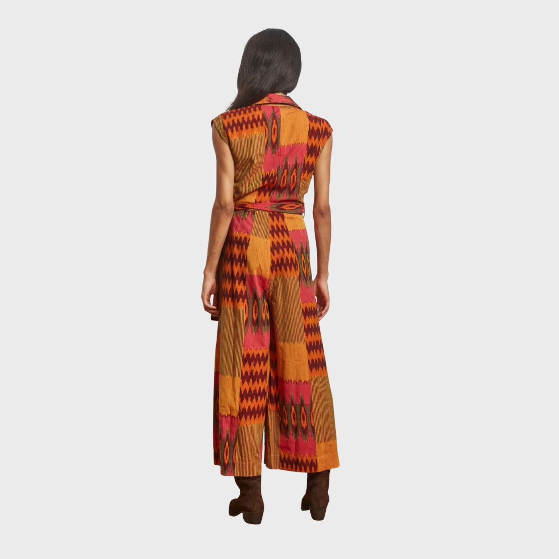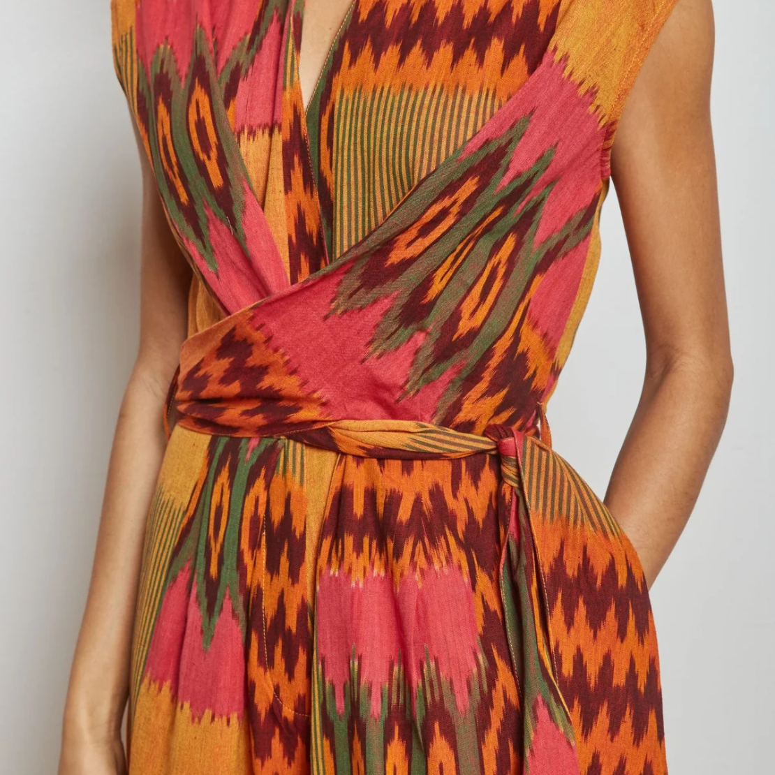 Vibrant ikat-inspired patchwork print in rich shades of red, orange, pink, and mustard