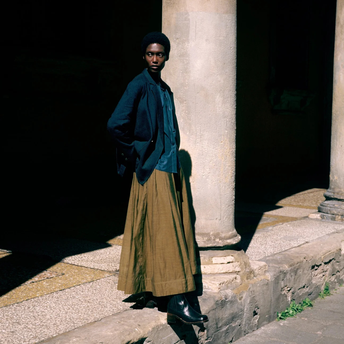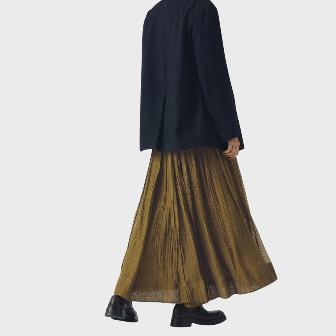 Our skirt is made from a blend of organic cotton and silk with a subtle crinkle effect. Stitched down knife pleats fall from the waistband, guiding the flow of the full-length skirt. Secured at the side with a button placket, finished with in-seam pockets and lined with cotton.