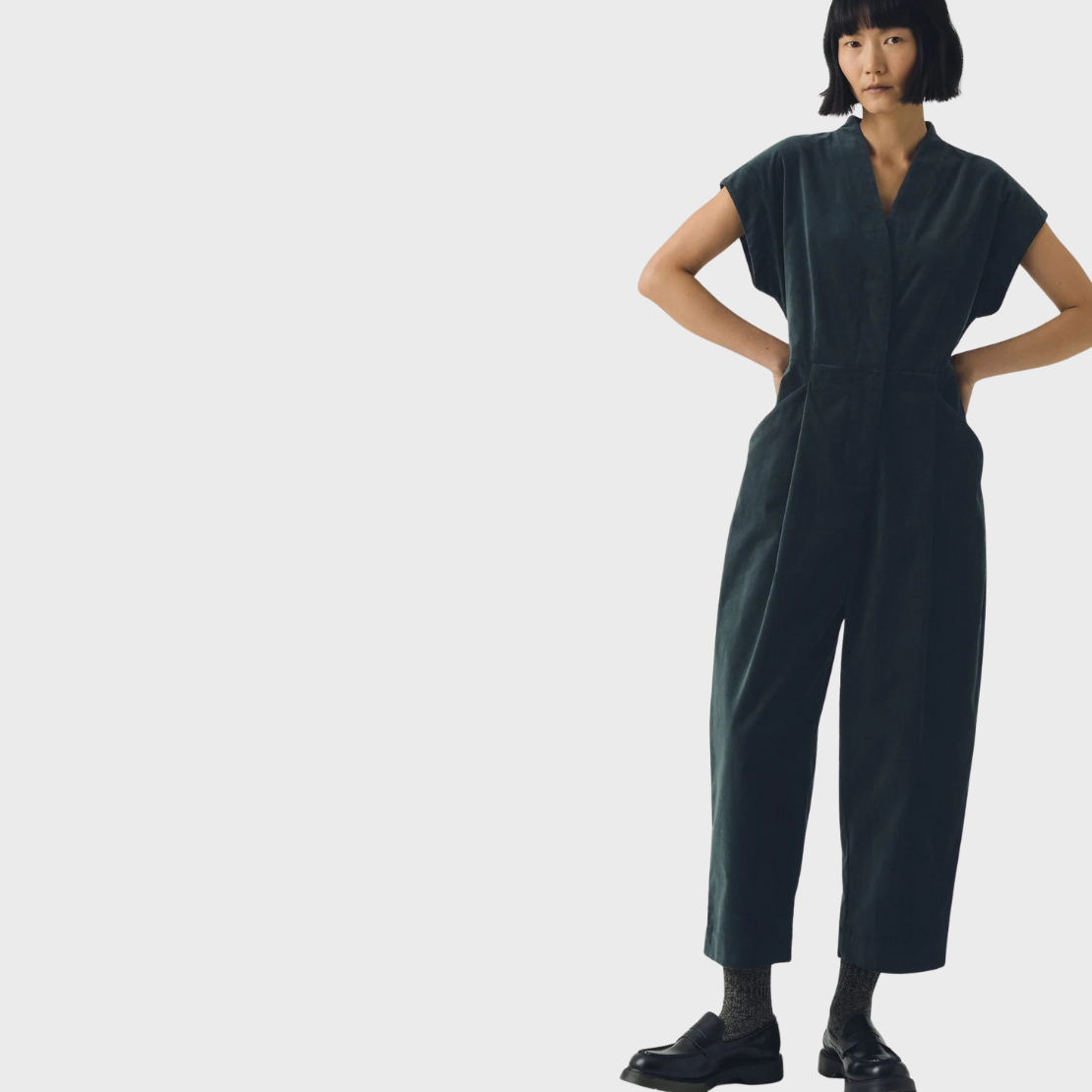 Made from soft organic cotton velvet, our jumpsuit has short sleeves and a crossed V-neck. With pleats at the front which taper into cropped leg. Finished with side and back pockets.