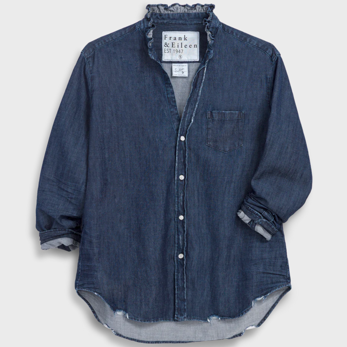 - Hand-distressed raw shirttail hem long enough to cover your bum