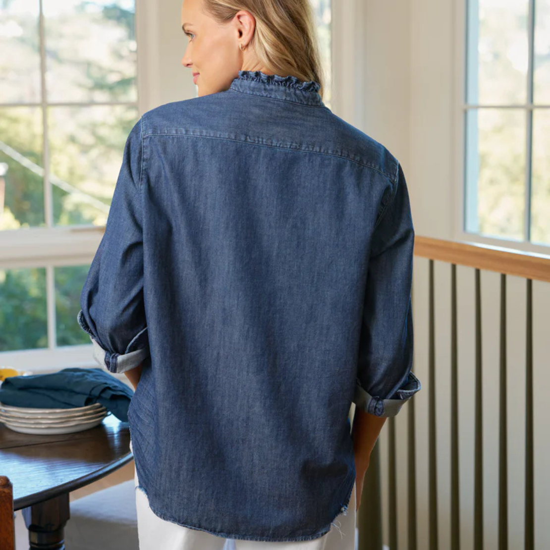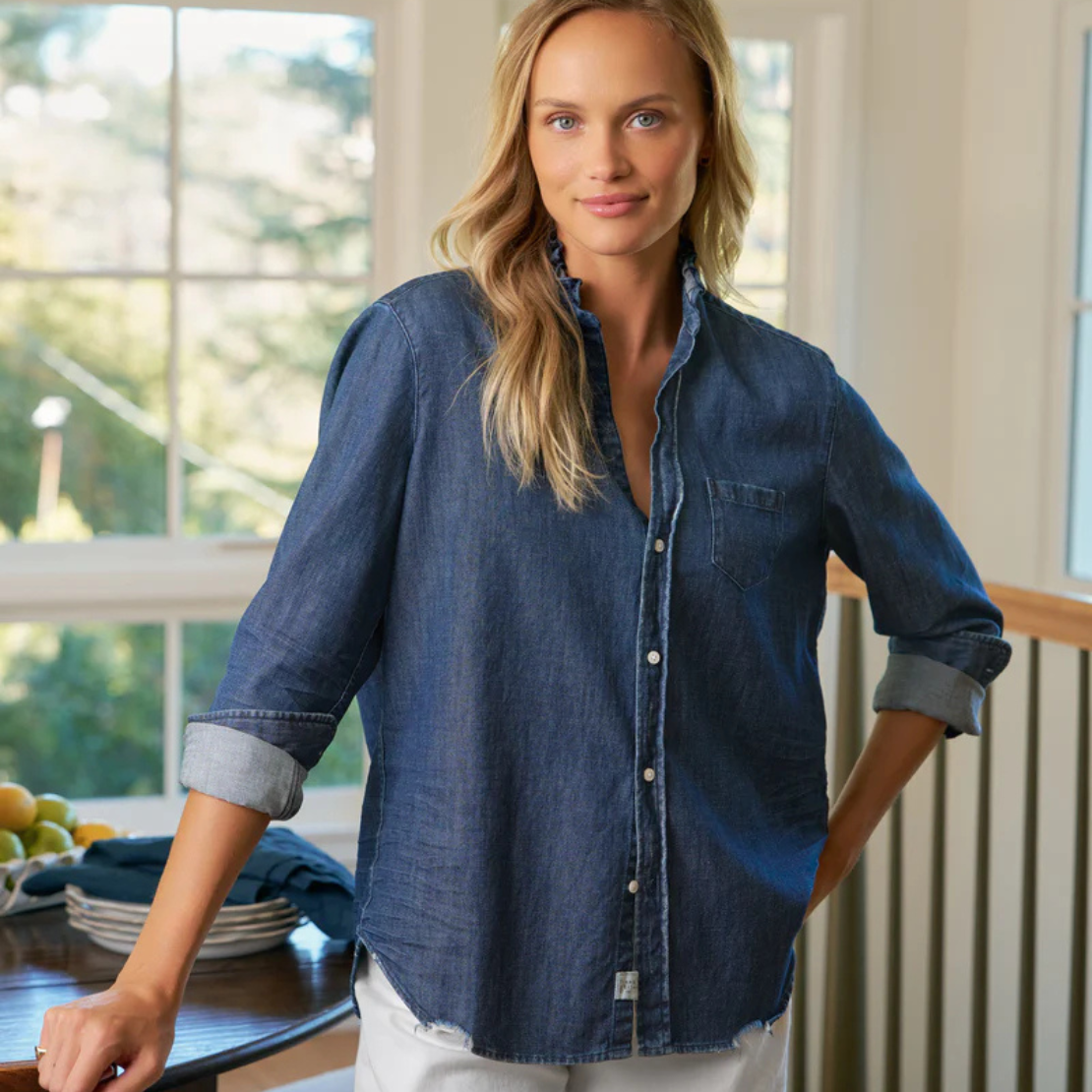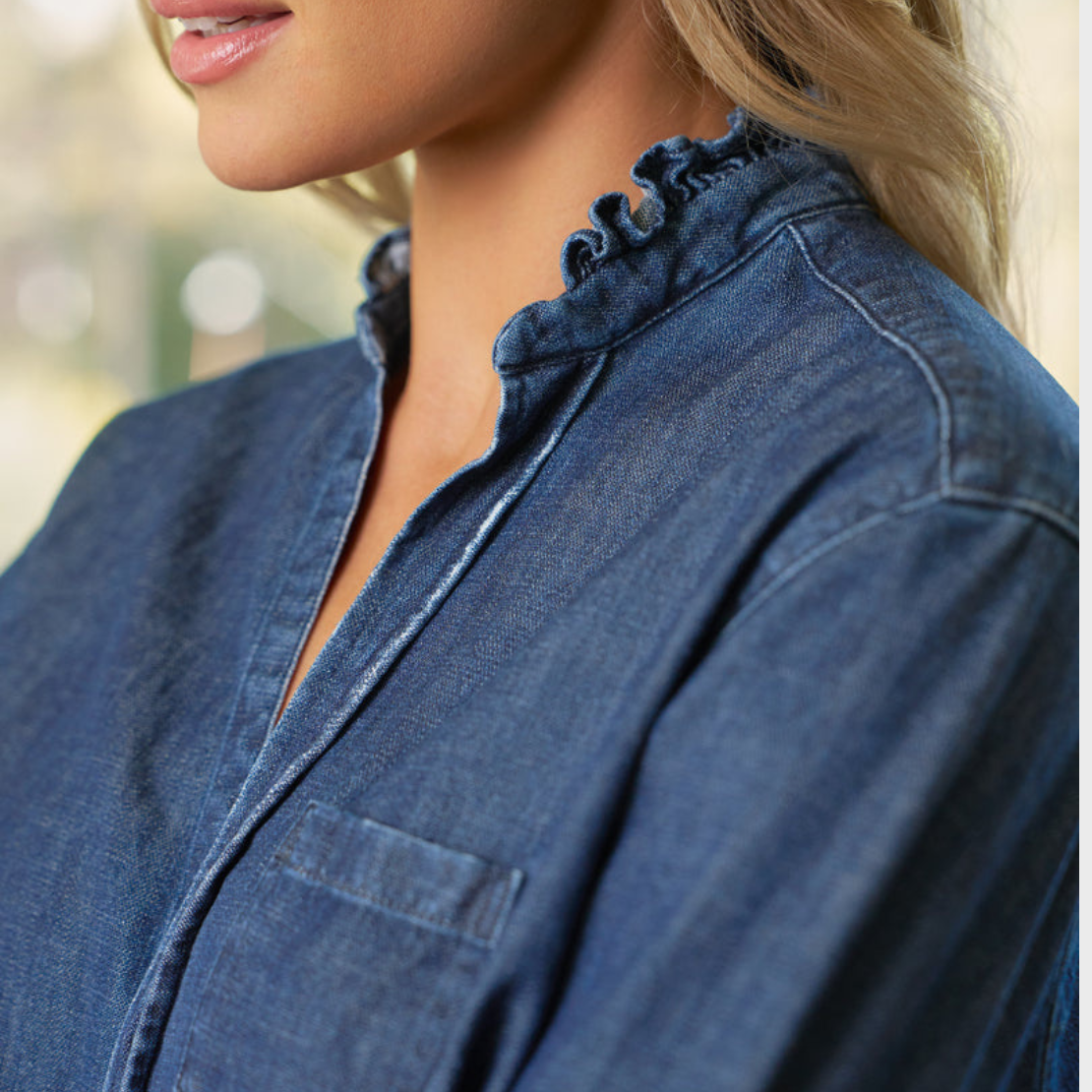 - Signature bust flattering button placement and long sleeves with button cuffs