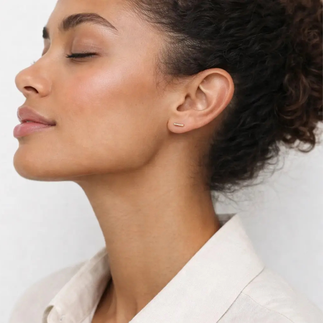 Simple and considered, these tiny bar studs are designed to disappear into your routine in the best way. The slim 10mm bar sits close to the ear, adding a subtle line of light that feels modern and unfussy. Understated enough for everyday wear, yet polished enough to feel intentional, this is the kind of piece you put on once and keep reaching for. Crafted in 14k gold fill, these studs are lightweight, comfortable, and made to be worn often, whether worn alone or layered with other favorites.