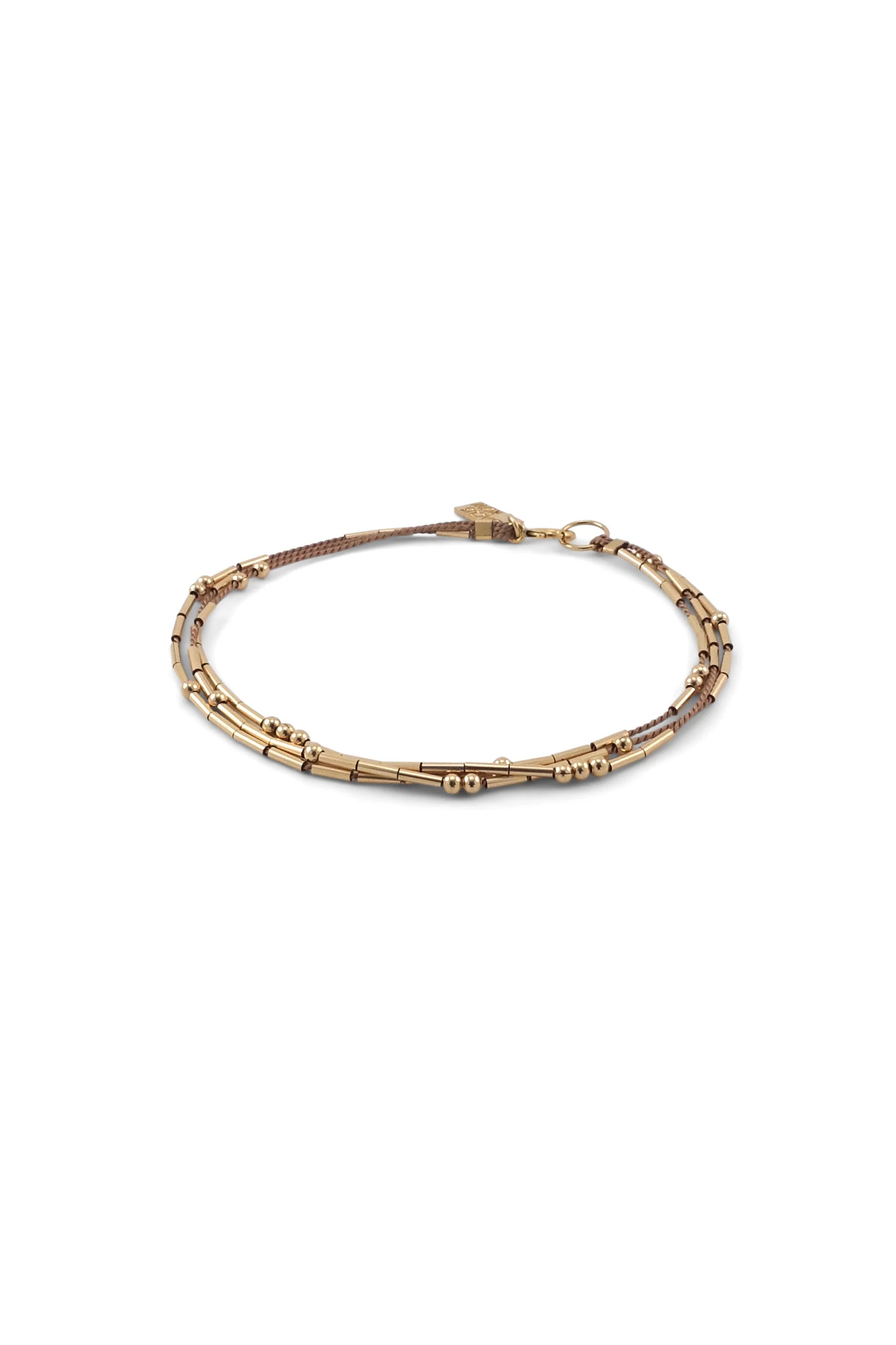 A refined and effortless bracelet designed to elevate your day-to-day. Our Ara is a triple-stranded silk cord bracelet stacked with gold tubes and rounds that shift freely. This piece pairs excellently with our Orion bracelet to create a more statement look.