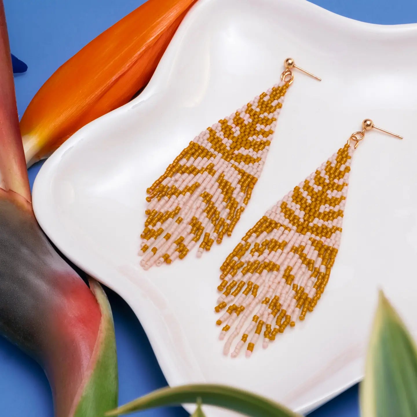 These elegant bohemian fringe beaded earrings are handcrafted with premium Japanese Miyuki glass beads and feature a unique leaf vine motif that is reversed both in position and color throughout the earring. Striking color combinations make these a standout statement accessory. The earring is hung from a stainless-steel ball post. These earrings are handmade by women artisans in Medellin, Colombia who receive fair working conditions and compensation for their skills.