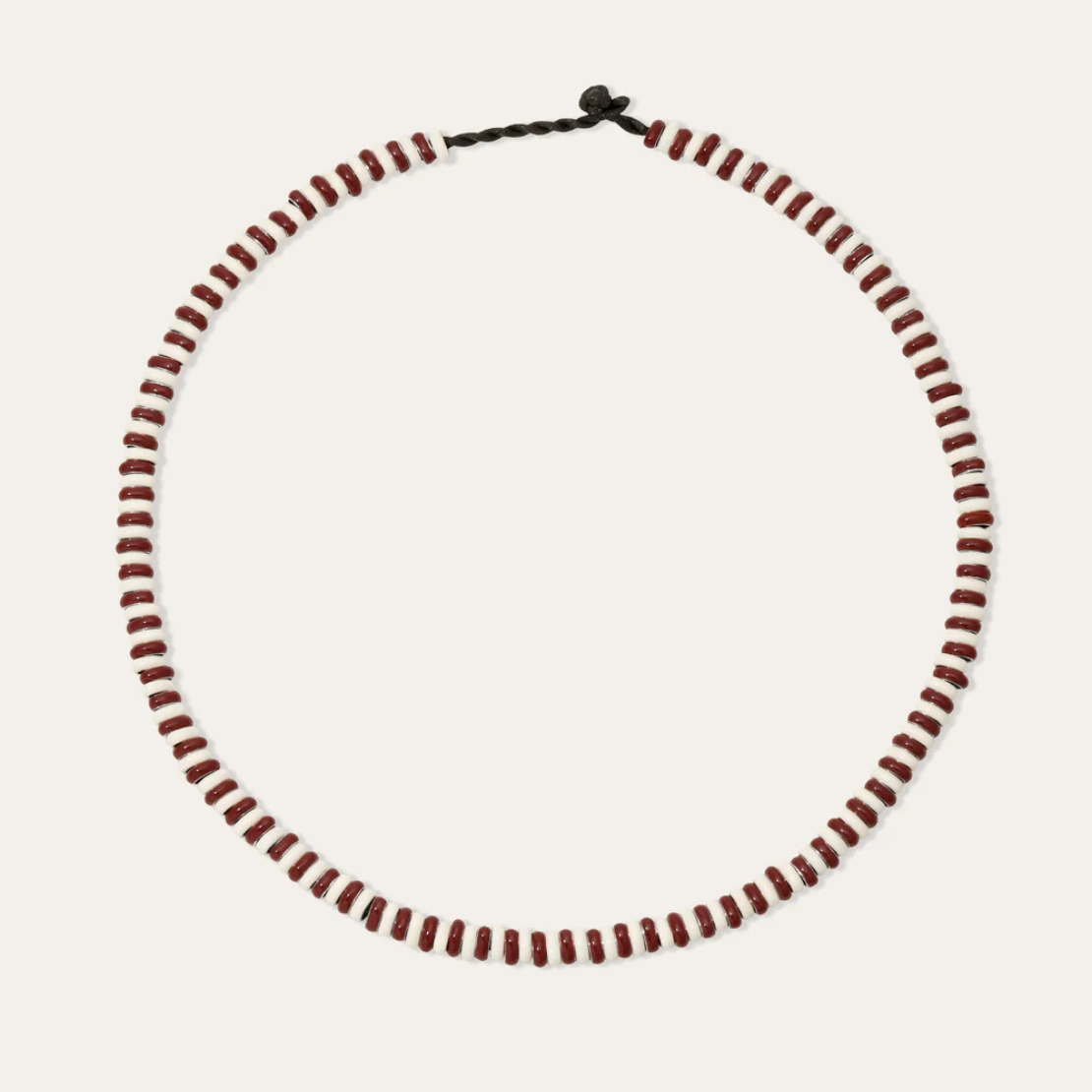 Our limited-edition Cherry Soda Stripes Full Enamel Mini Bead Necklace reimagines the classic stripe pattern in a fresh, fall-forward palette. Glossy white and maroon enamel–wrapped sterling silver beads are hand-strung on black satin cord, creating a bold yet playful rhythm of color. Wear it solo for a pop of pattern or pair it with hinged charms to make it your own.