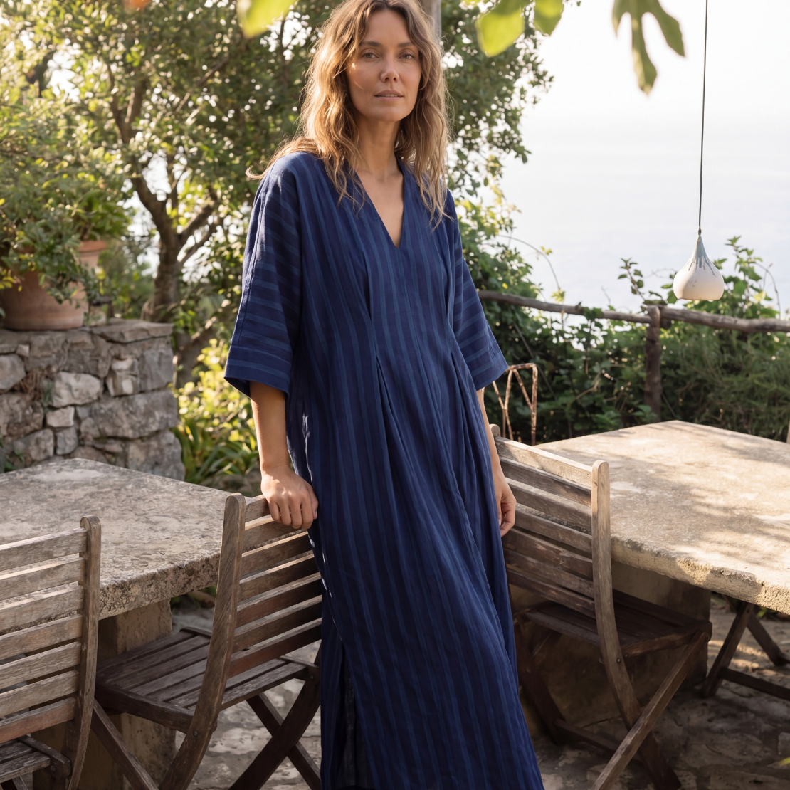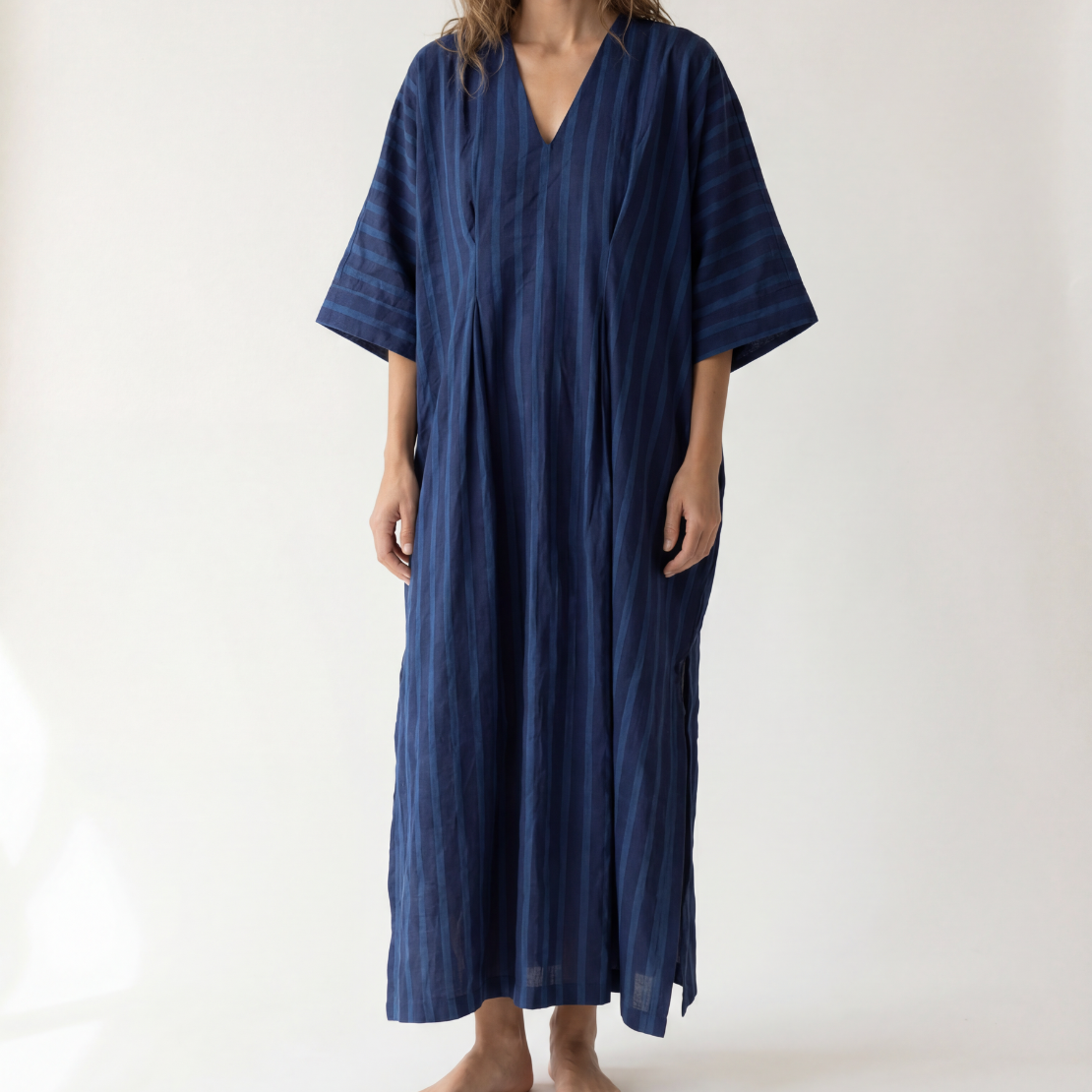 A V-neck kaftan-style maxi dress, cut to a relaxed, flowing silhouette. Drop shoulders and front darts add shape while maintaining ease and gentle volume through the body.
