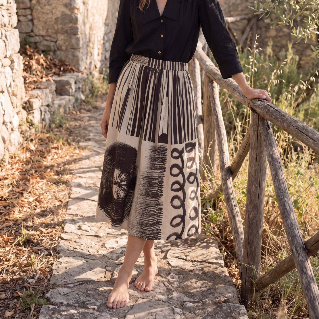 Crafted from naturally dyed cotton, featuring a combination of hand-painted and tie-dye techniques in bold black for a striking, graphic appeal.