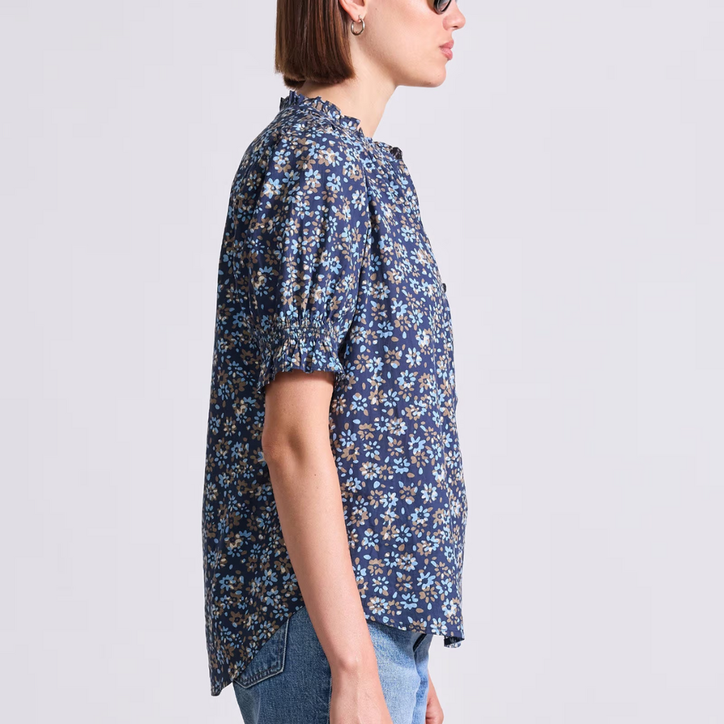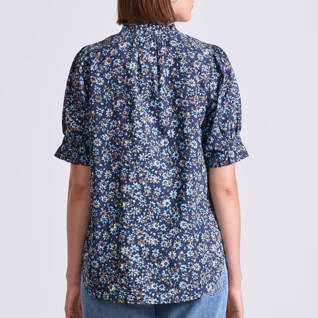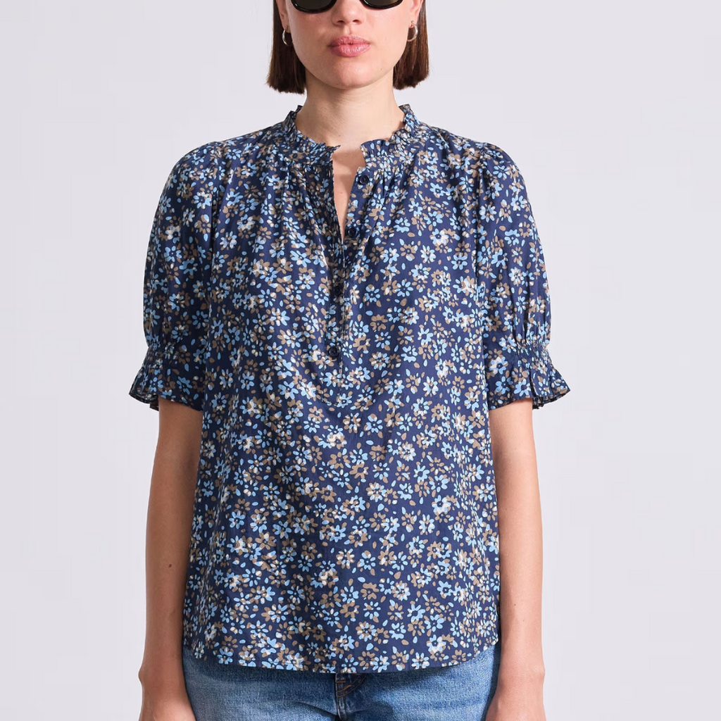 • Button closure, ruffled neckline, straight silhouette, high-low hem, short puff sleeves