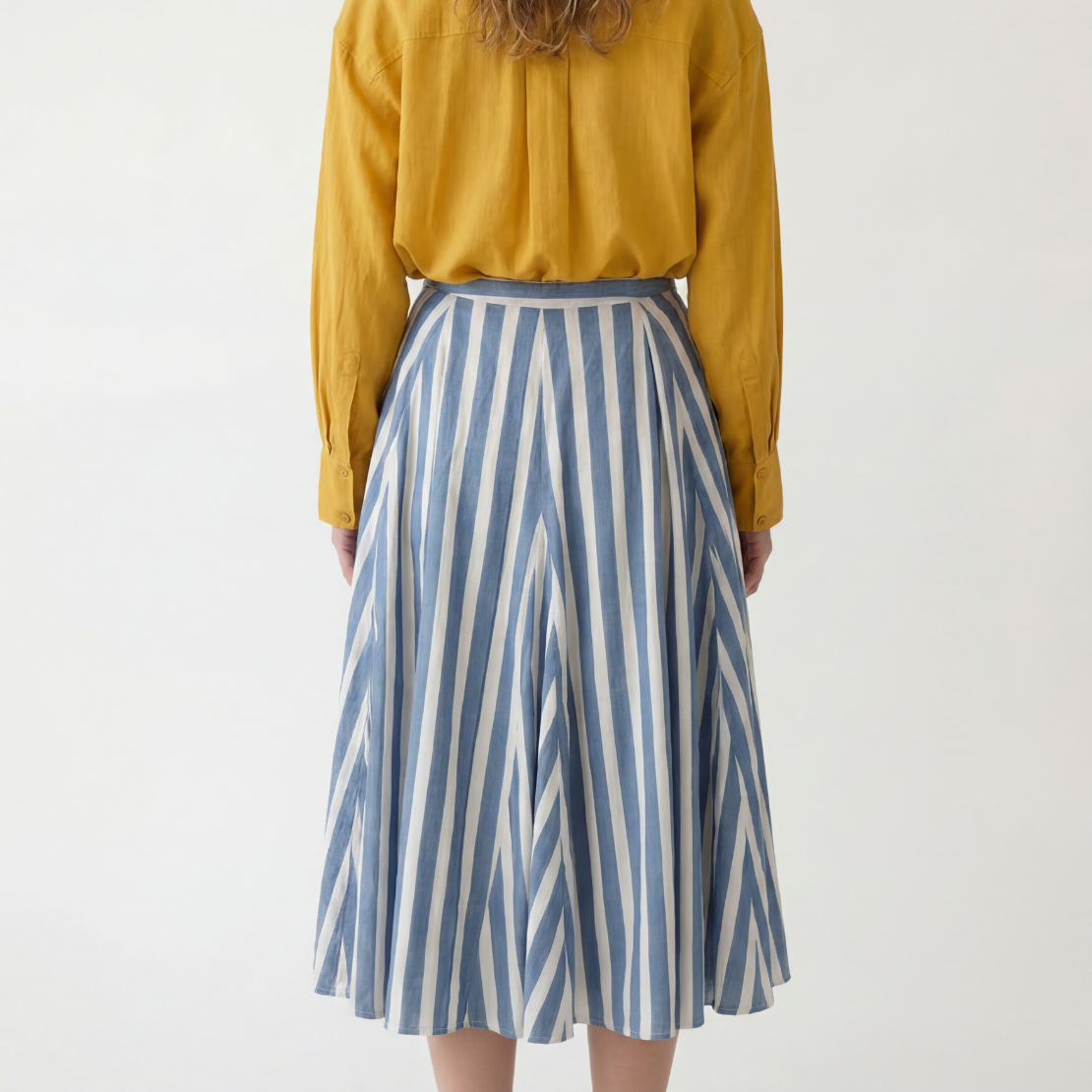 A panelled skirt with a soft, flared silhouette in blue and white. Designed with multiple panels that create generous volume and fluid movement through the hem while keeping the waist structured and clean.