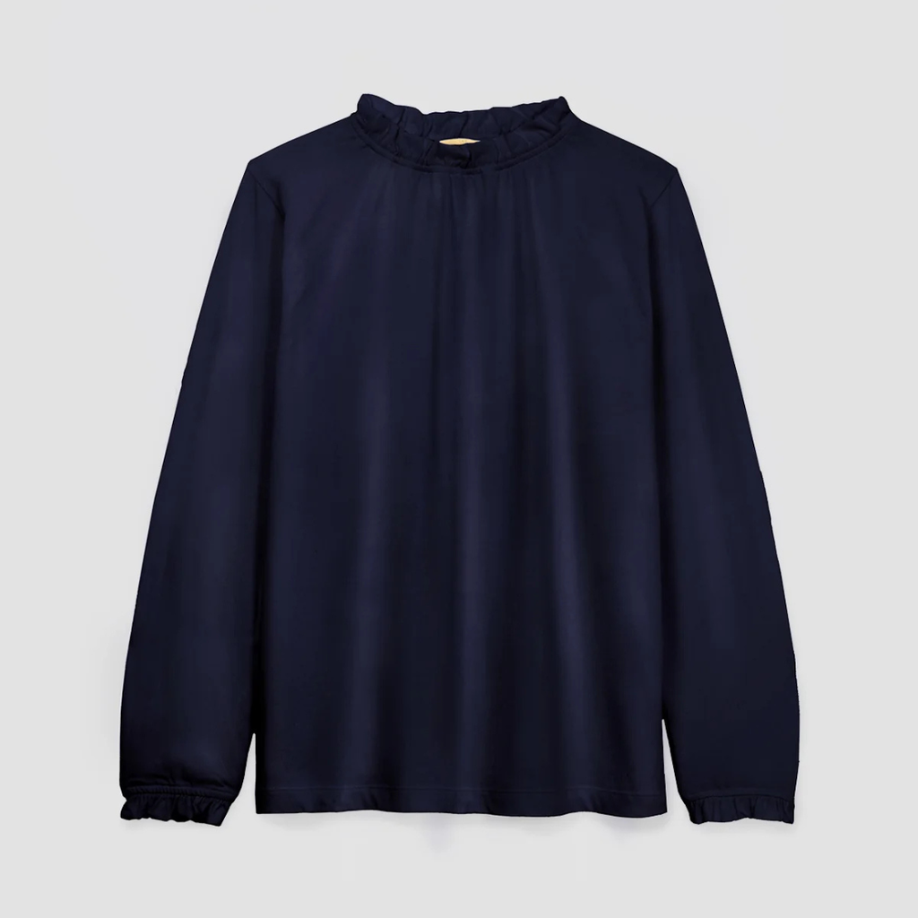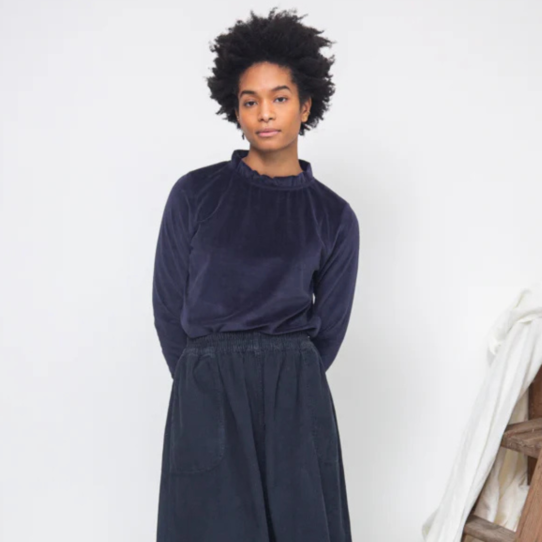 The Pearl-Jane is a long sleeved top with a subtle ruffle detail at the neck and cuffs. Crafted from our luxuriously soft textured velour.