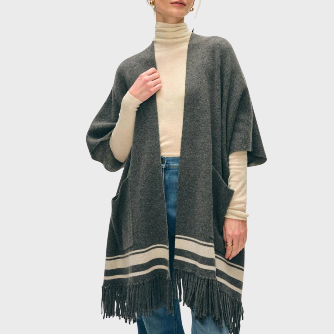 Crafted from a luxurious blend of wool and cashmere, this elegant poncho is a perfect layering piece. It features a sophisticated two-tone design and a fringe detail along the hem. The cozy, draped silhouette includes two front pockets, making it both stylish and functional.