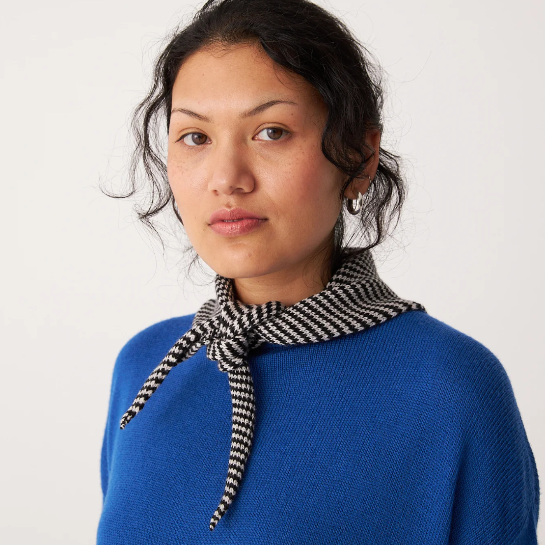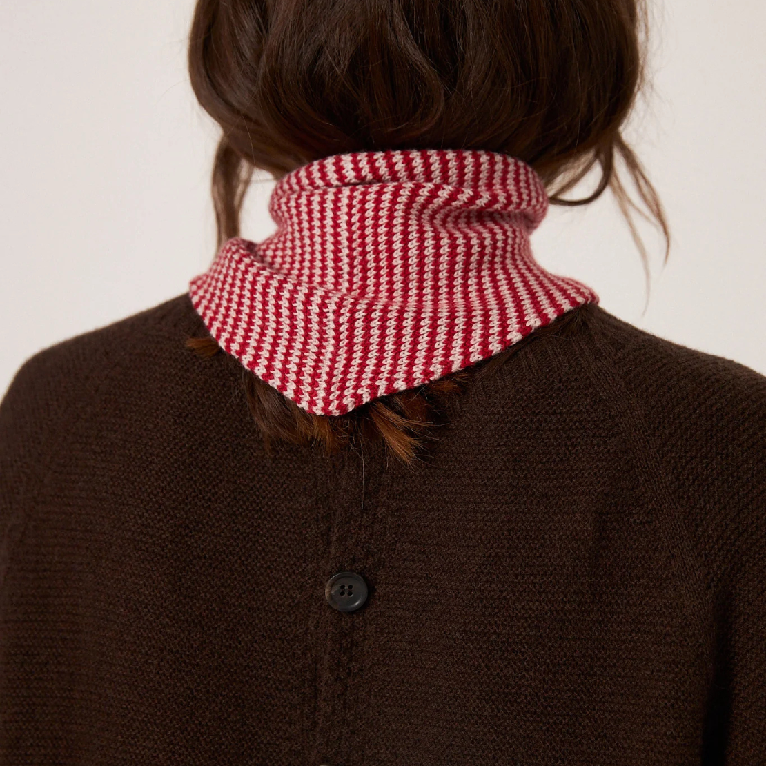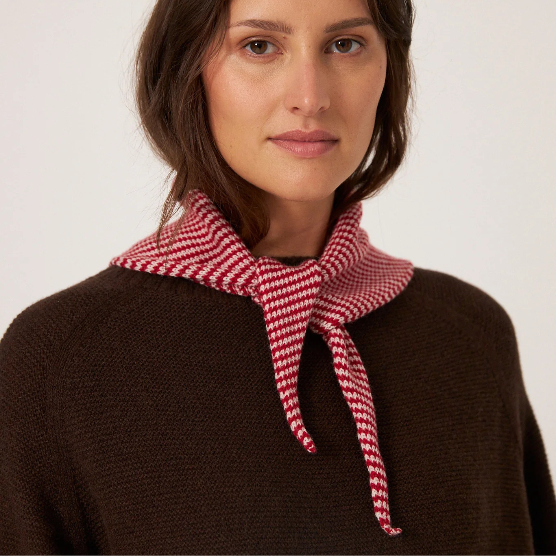 The nostalgic little Francie scarf, knitted in a chic stripe, can be worn in a multitude of ways. Knitted thickly enough to provide soft, breathable warmth when tied twice around the neck, yet light-weight enough to be worn as a headscarf too.