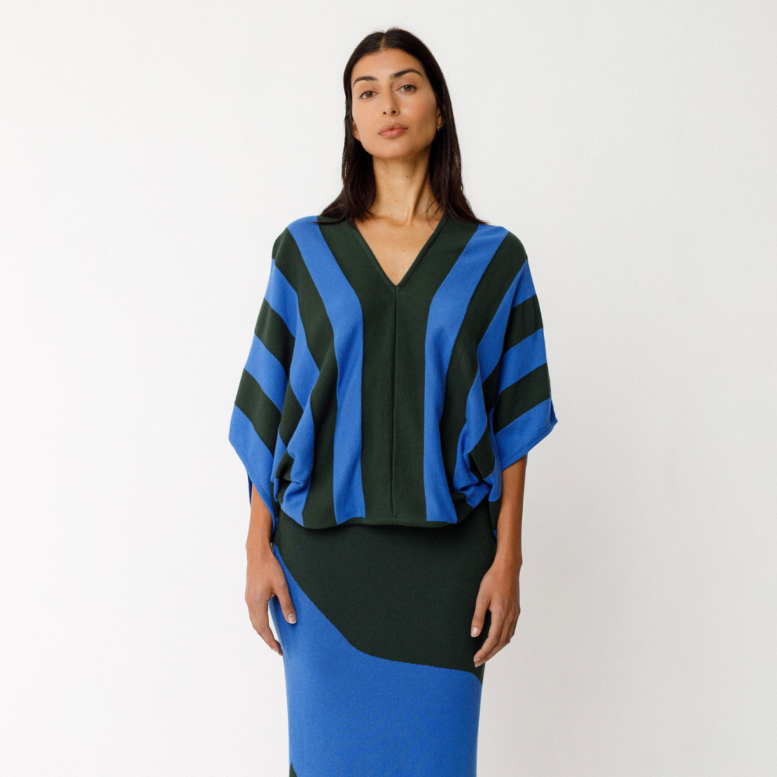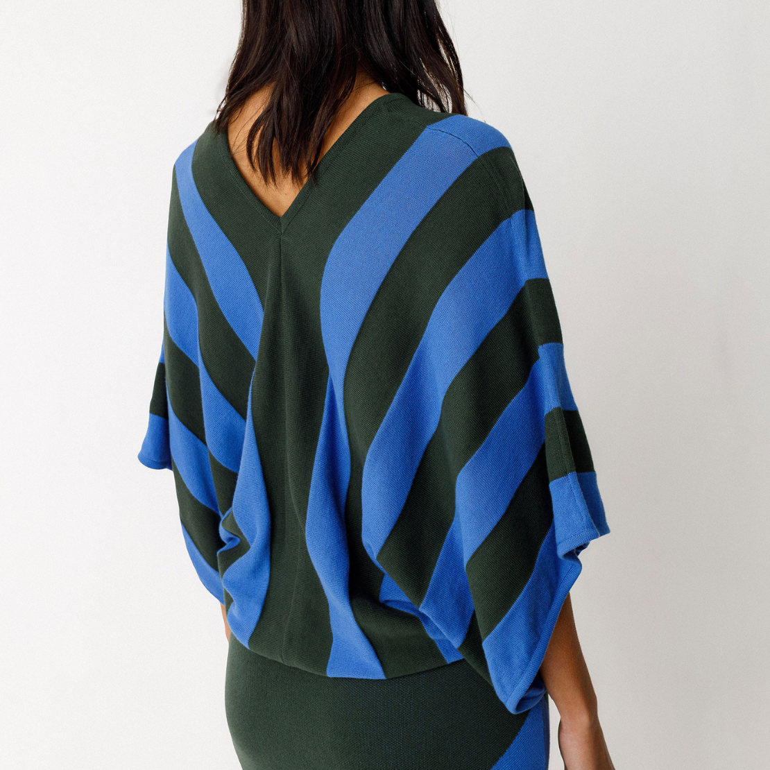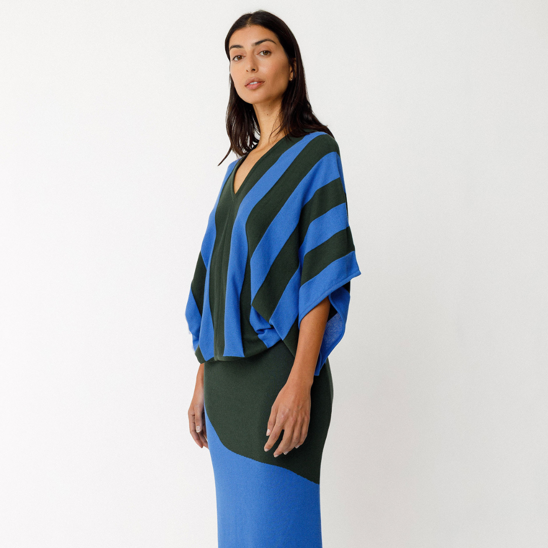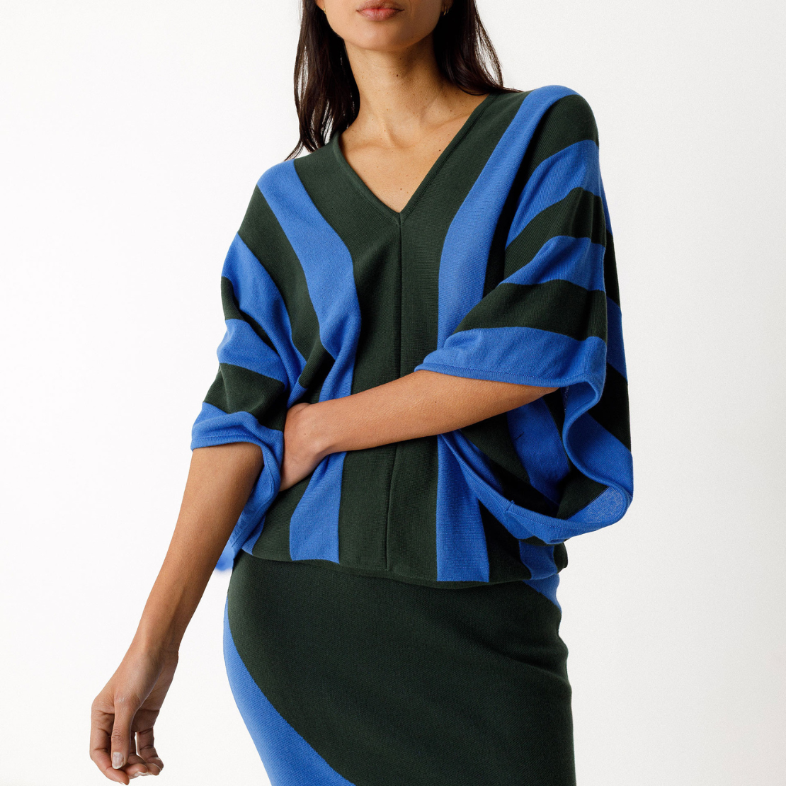 Loose-fitting, two-tone sweater in lightweight GOTS-certified organic cotton knit. It features a deep V-neck and 3/4-length kimono sleeves.