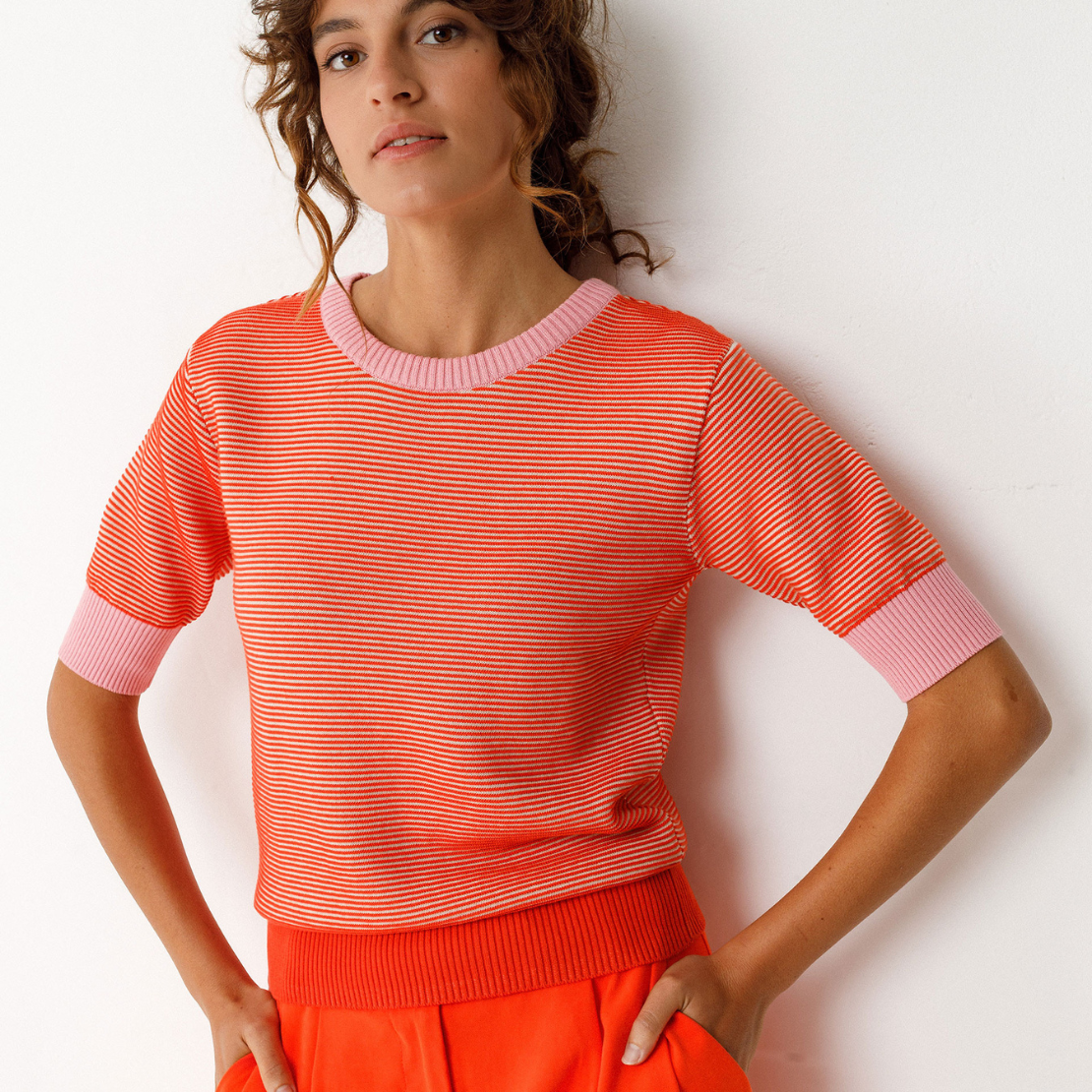 Two-tone textured sweater made from lightweight GOTS-certified organic cotton knit. It features a round neckline, 3/4-length sleeves, and ribbed trim at the neckline, cuffs, and hem.