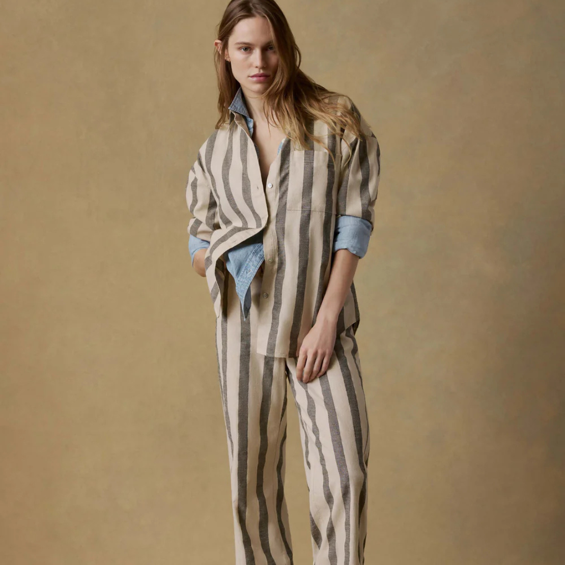 Crafted from a yarn-dyed cotton-linen blend, this oversized button-up is inspired by a vintage find and washed for a balanced hand feel that’s soft yet structured. The Pine Bay Stripe adds subtle depth.