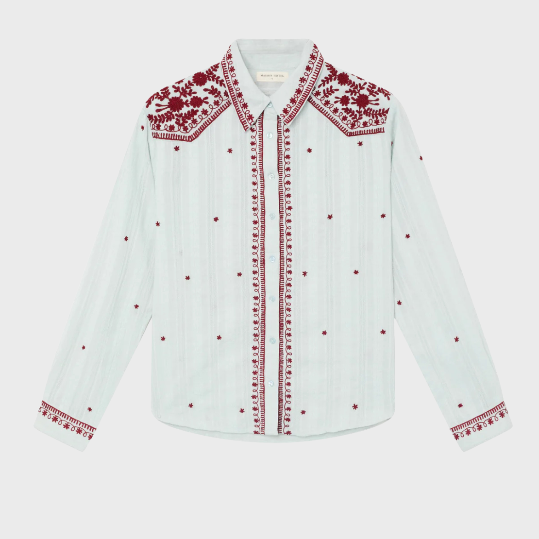 Warm whisper-blue base with delicate red embroidered motifs scattered across the body. Denser floral embroidery frames the shoulders and collar. Two vertical embroidered bands run along the placket, creating structure and elongation.