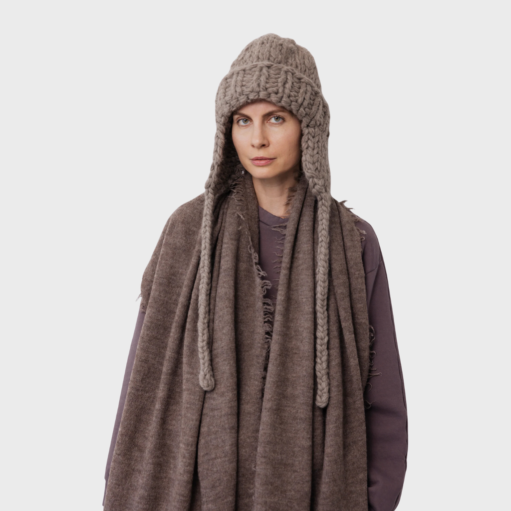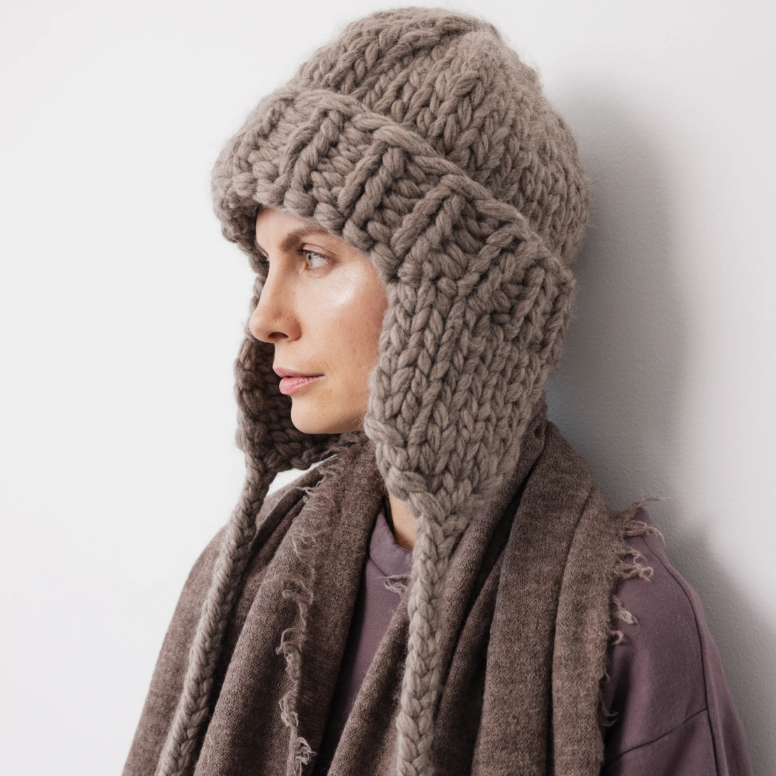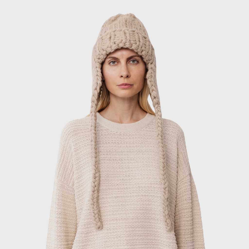 Oversized handknit hat with rib cuff, ear flaps and braided ties. For the coldest days. Produced with our Fair Trade certified, woman-owned production partners. They collaborate with highly-skilled artisans for hand-work as well as industrial machine knitting. These are knit by hand with loosely spun chunky wool.