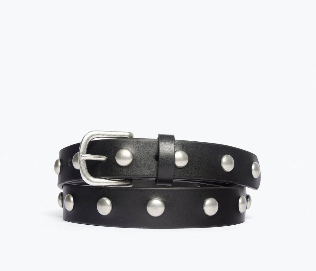 The studded classic. Made by hand with Italian black calf and reimagined this season with statement oval studs, the REBECCA belt is made for the natural waist and has a timeless buckle. Designed to tie every look together, we love how this style adds polish to everything in your closet.