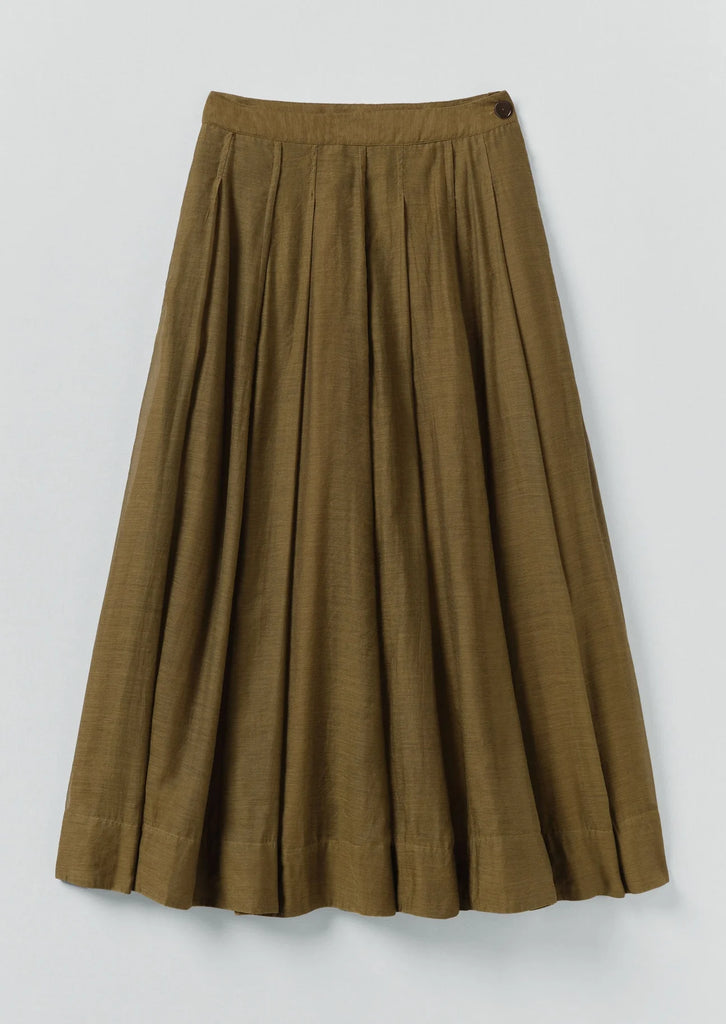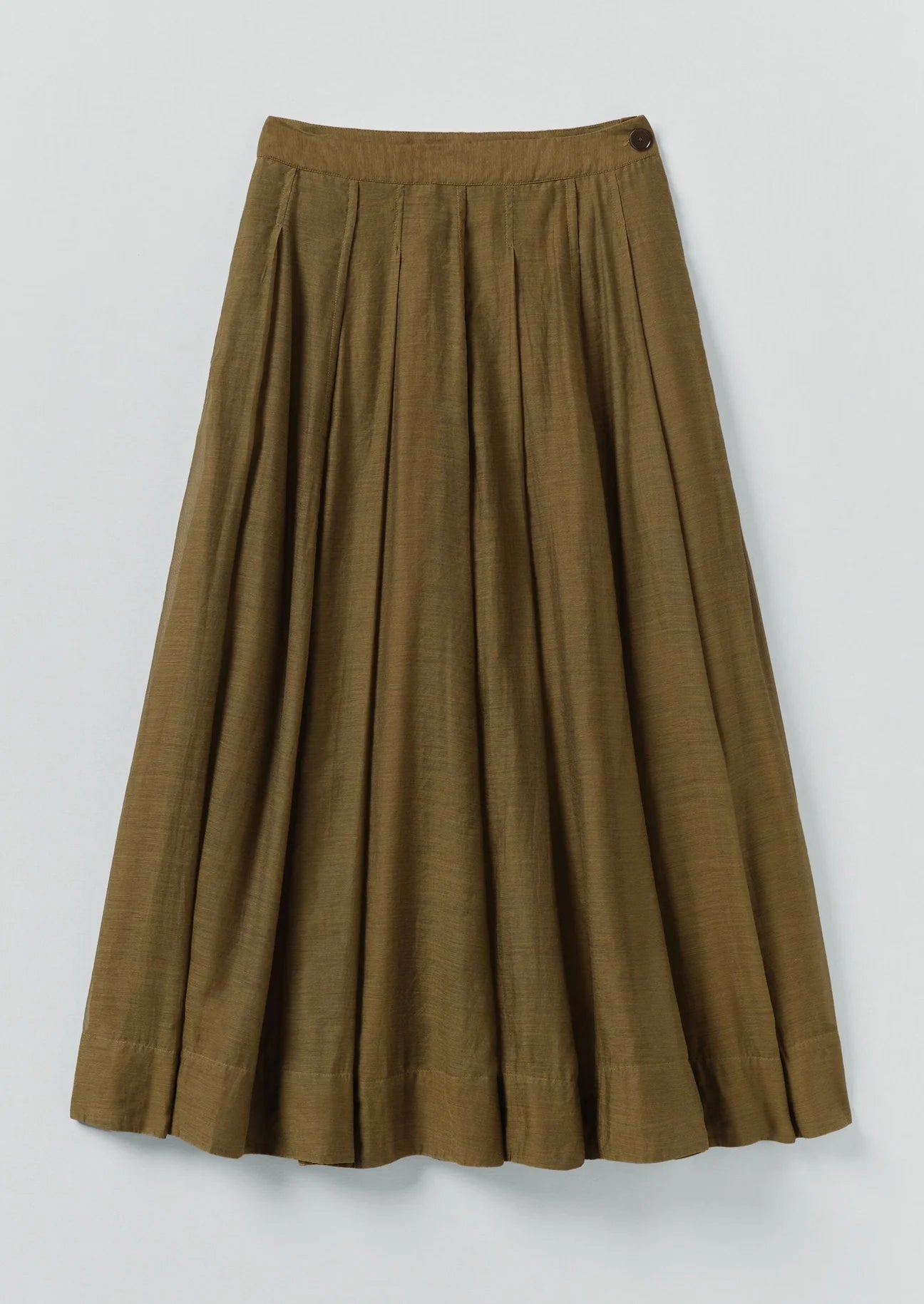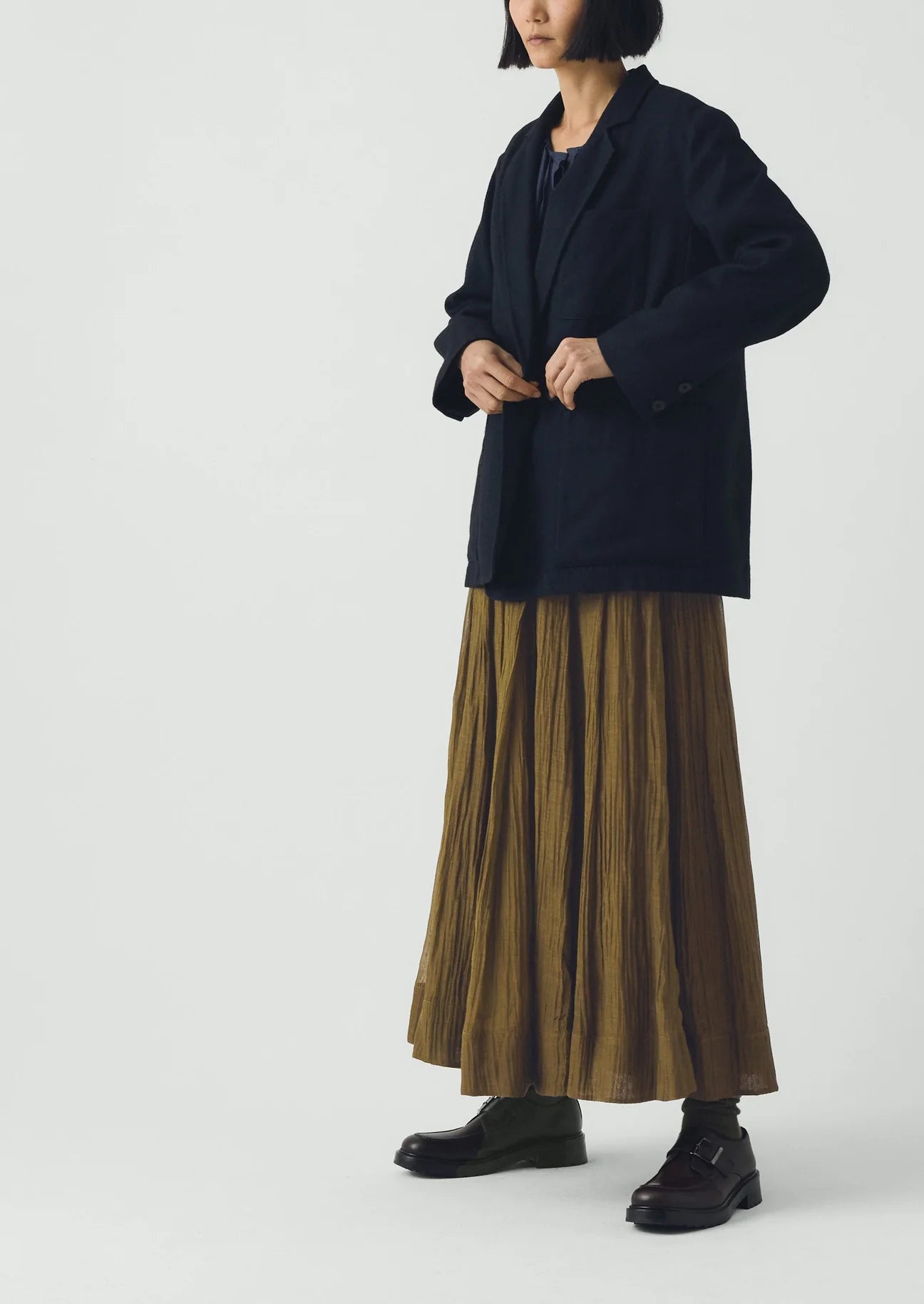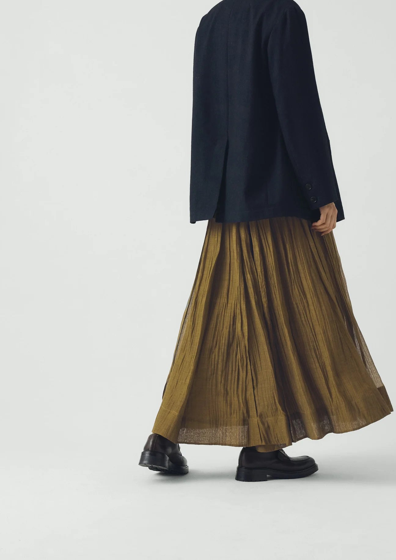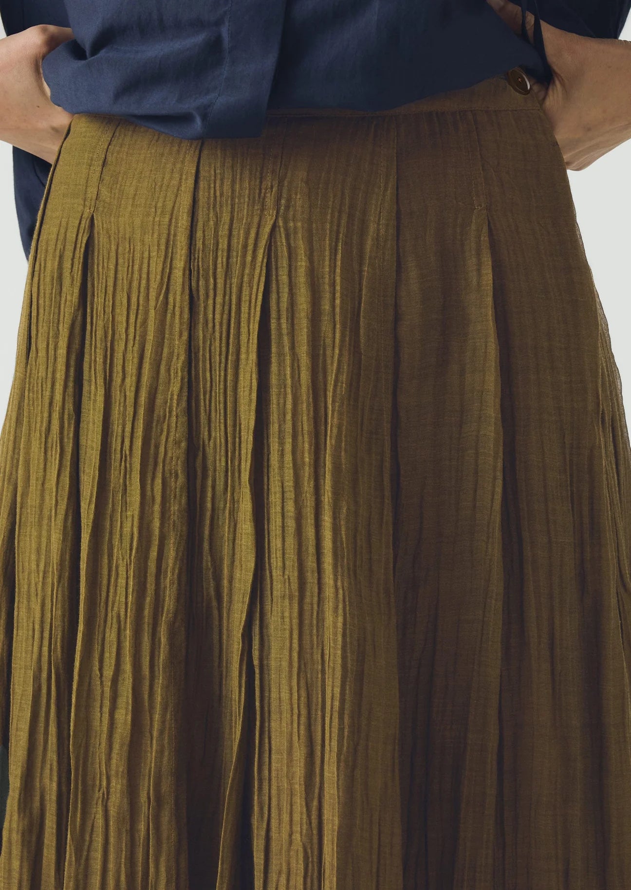 Our skirt is made from a blend of organic cotton and silk with a subtle crinkle effect. Stitched down knife pleats fall from the waistband, guiding the flow of the full-length skirt. Secured at the side with a button placket, finished with in-seam pockets and lined with cotton.