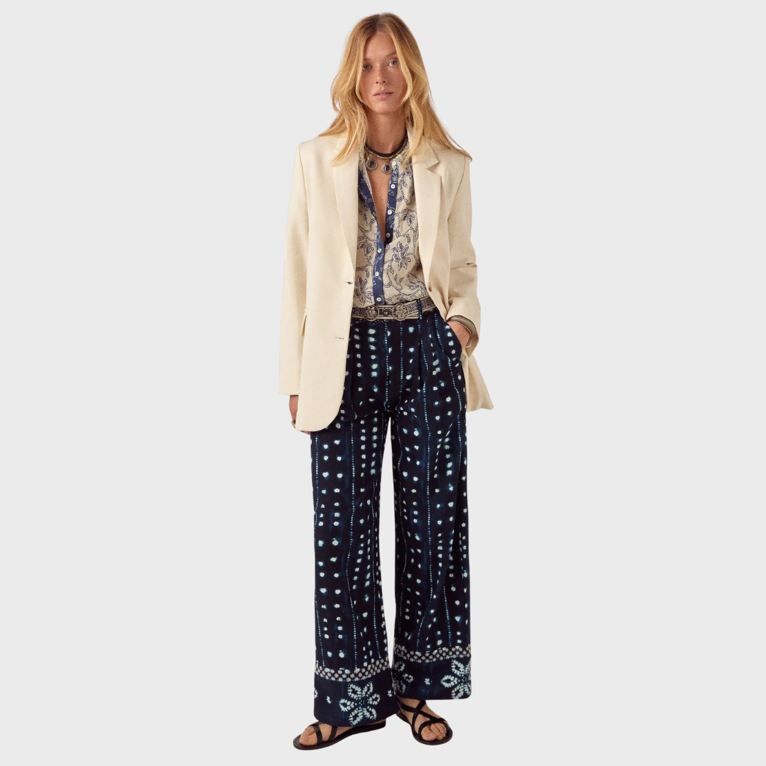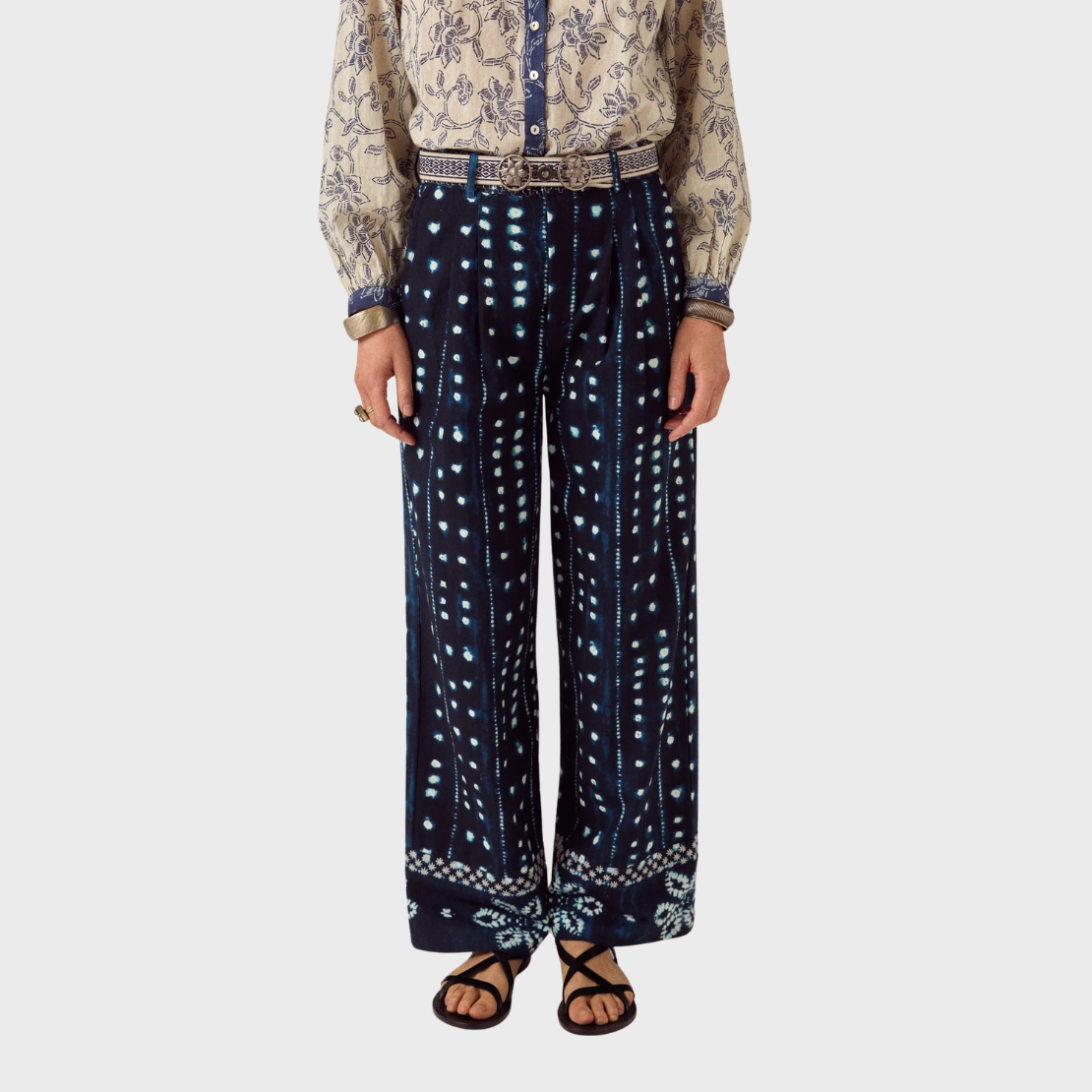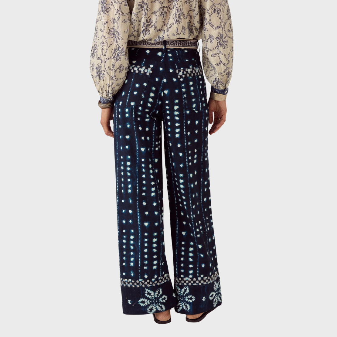 Wide-leg trouser in midnight navy with sky blue shibori print. Cut in cotton sheeting with a high waist and two pleats at the front. Side and back pockets. The leg falls straight and wide, finished with an embroidered border at the hem.