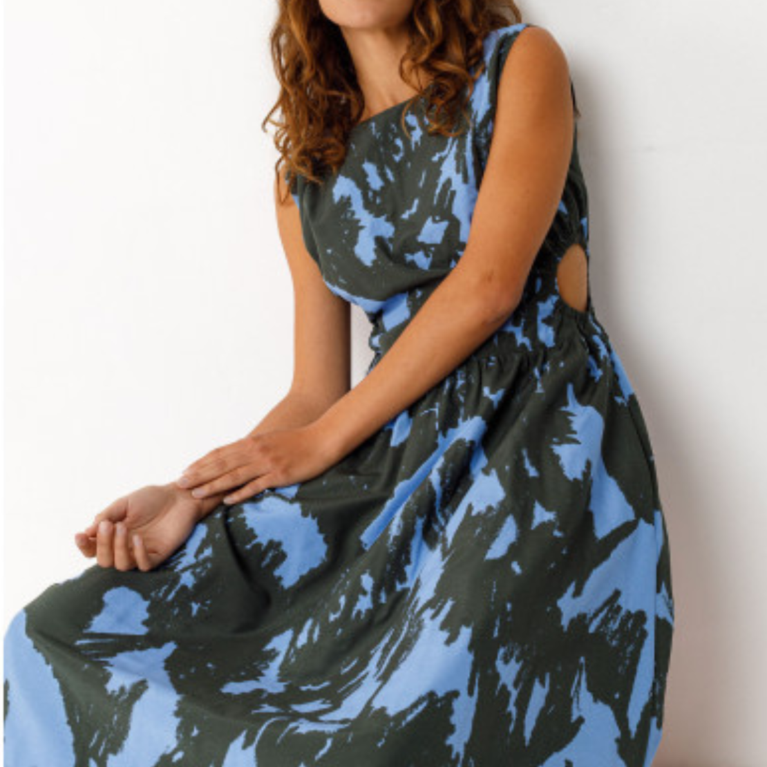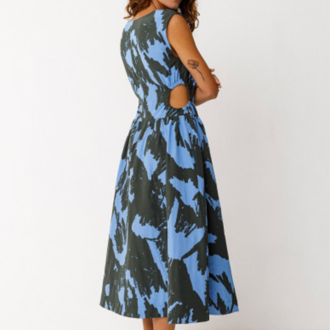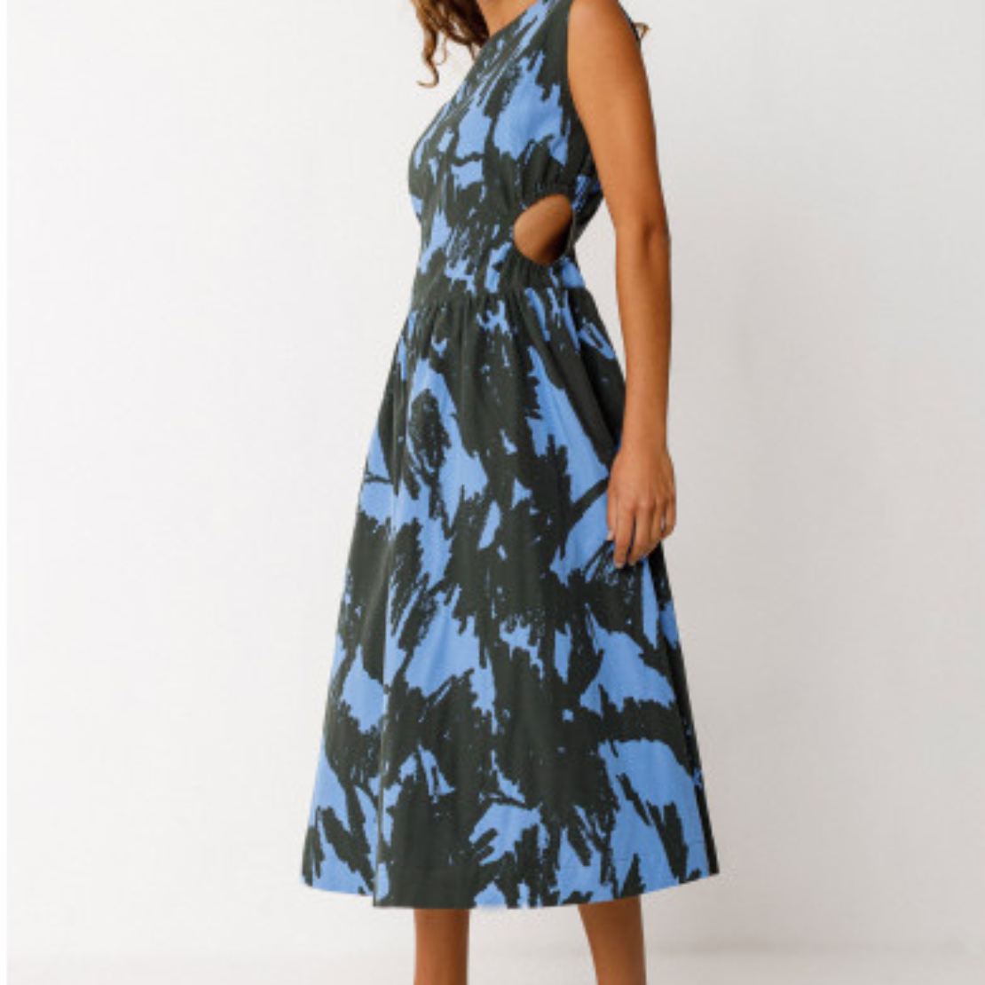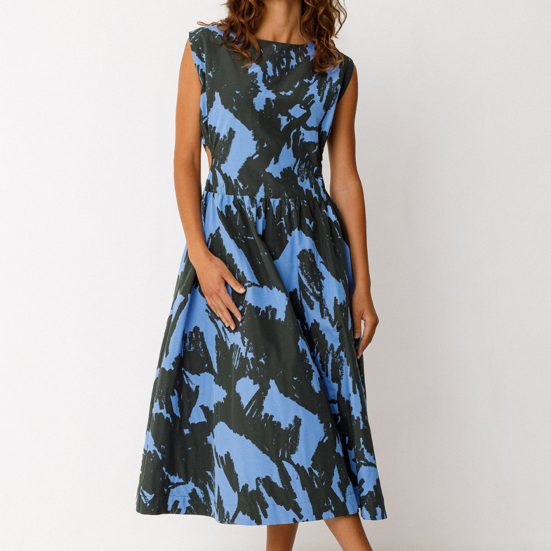 Mid-length sleeveless dress with a fitted cut and decorative cutout at the waist. Round neckline and concealed zip closure at the back.