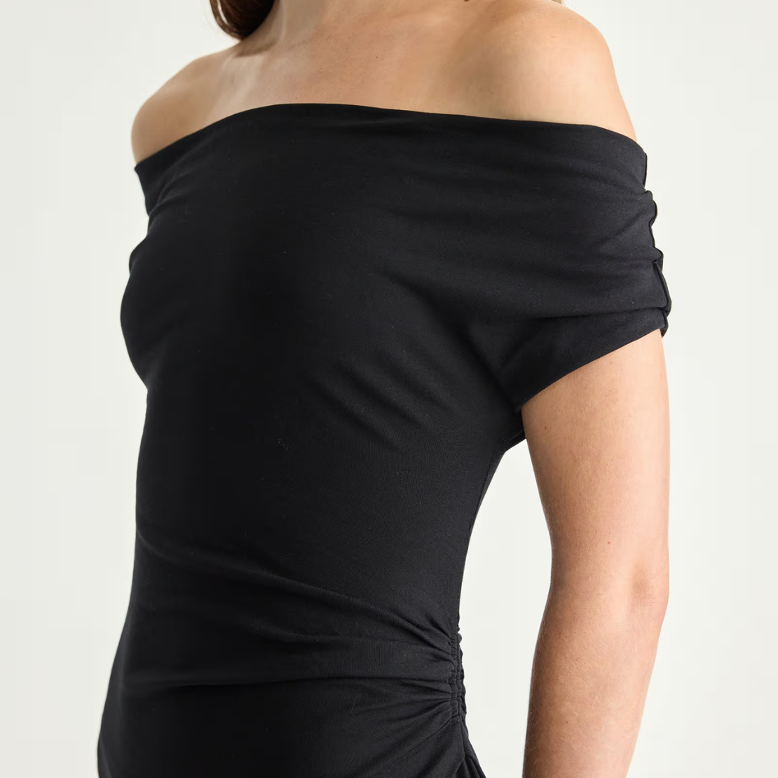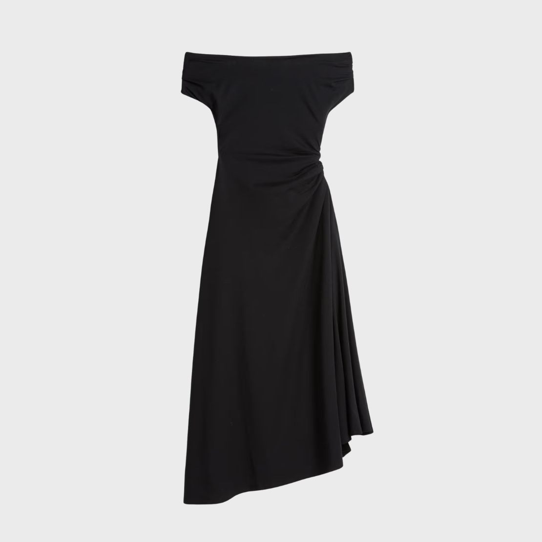 A comfortable off-the-shoulder midi with a playful twist — soft jersey gathers at the waist for a draped, flirty A-line skirt that moves with you. Crafted in a fluid cotton jersey.