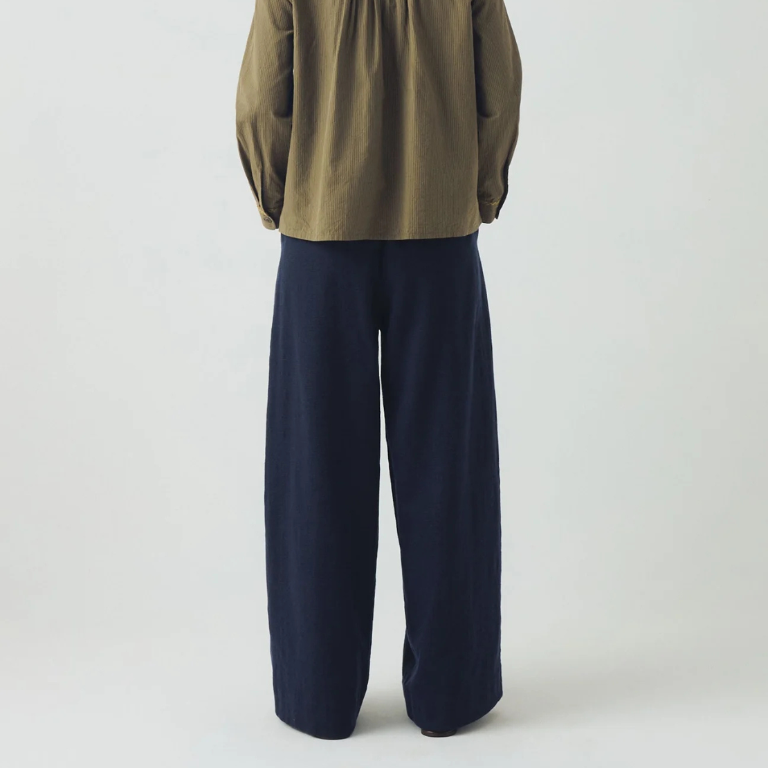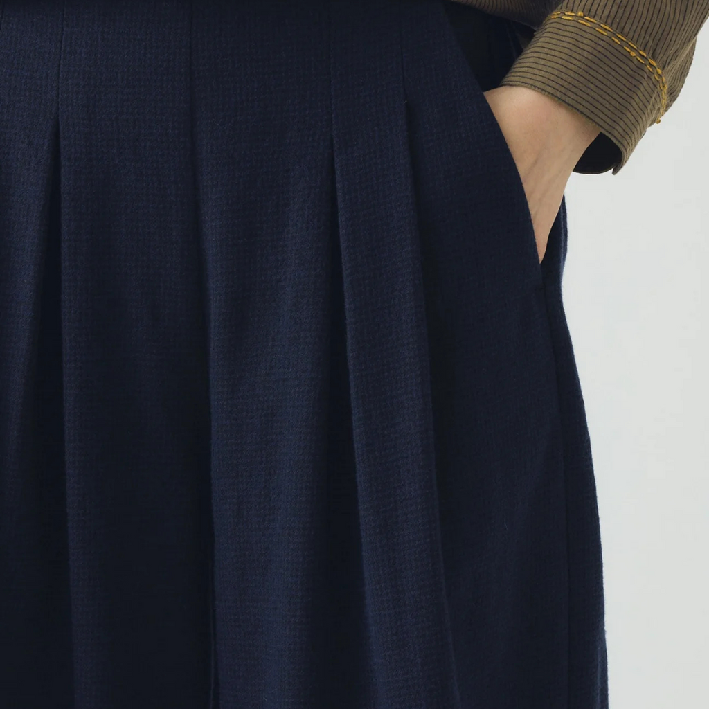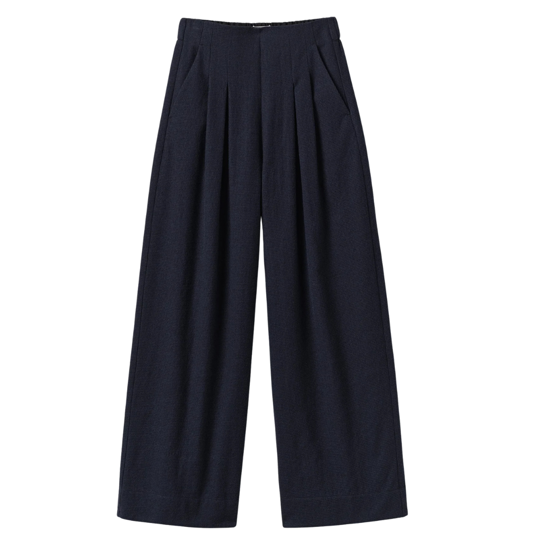 Our pants are shaped with inverted box pleats at the waist, falling to sweeping wide legs for a considered silhouette. Made from organic cotton blended with wool in a micro houndstooth weave. An elasticated back waist ensures comfort. Finished with slant pockets and back welt pockets.