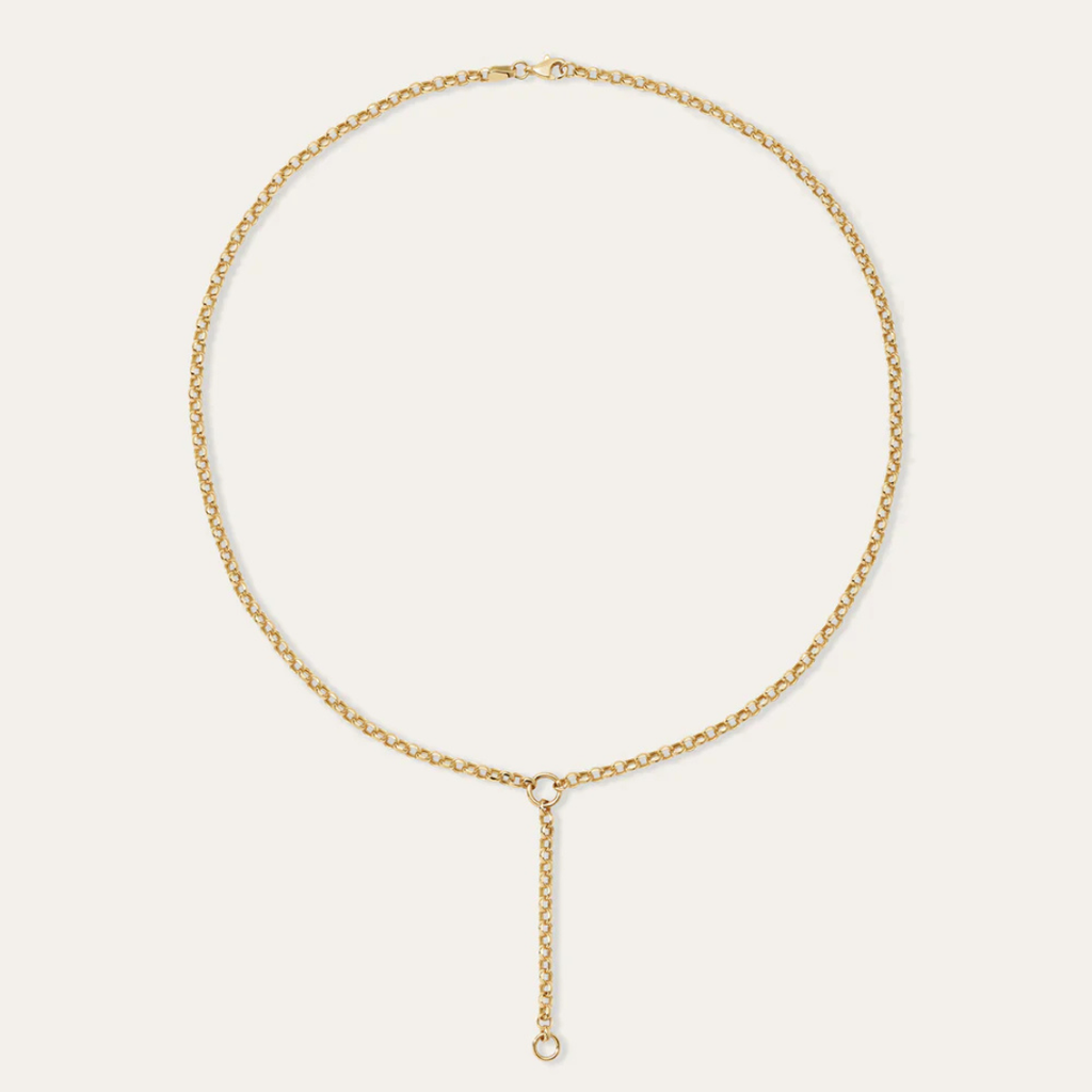 Introducing Adina Reyter's Rolo Chain Lariat Necklace. An exciting take on a bestselling favorite. The Rolo Lariat is handcrafted in 14k yellow gold, with each link individually hand-forged by skilled artisans to create a lightweight, effortless silhouette for everyday wear. Our Y-shaped necklace is both refined and versatile—designed to be worn solo or as a statement-making base for our charms and beads.