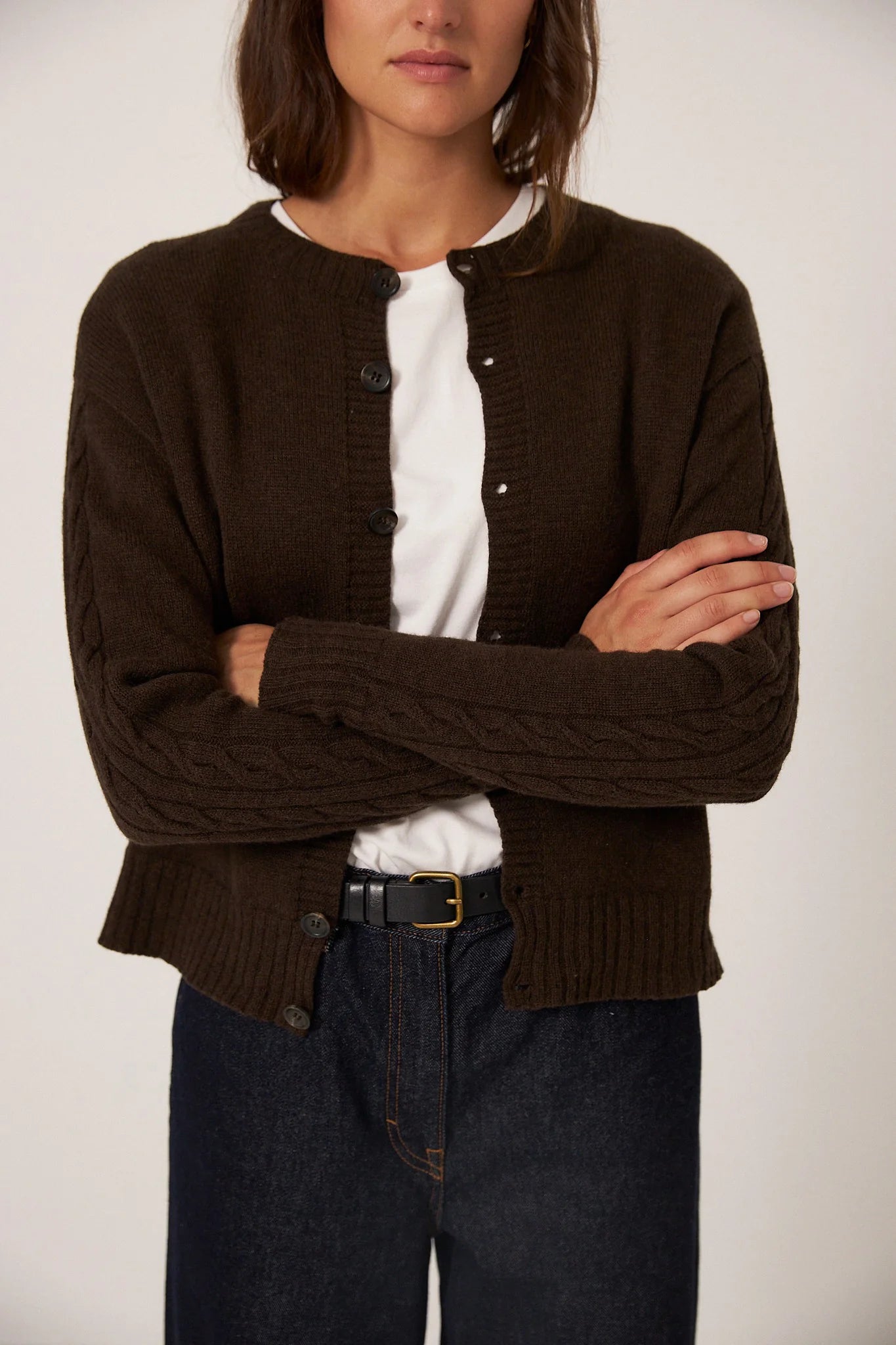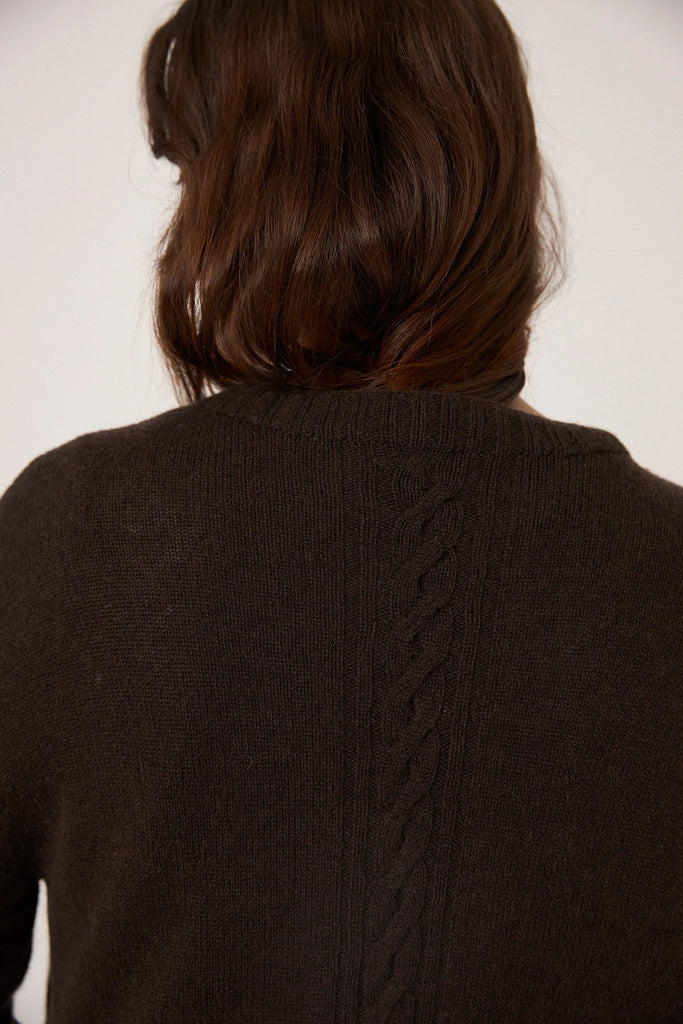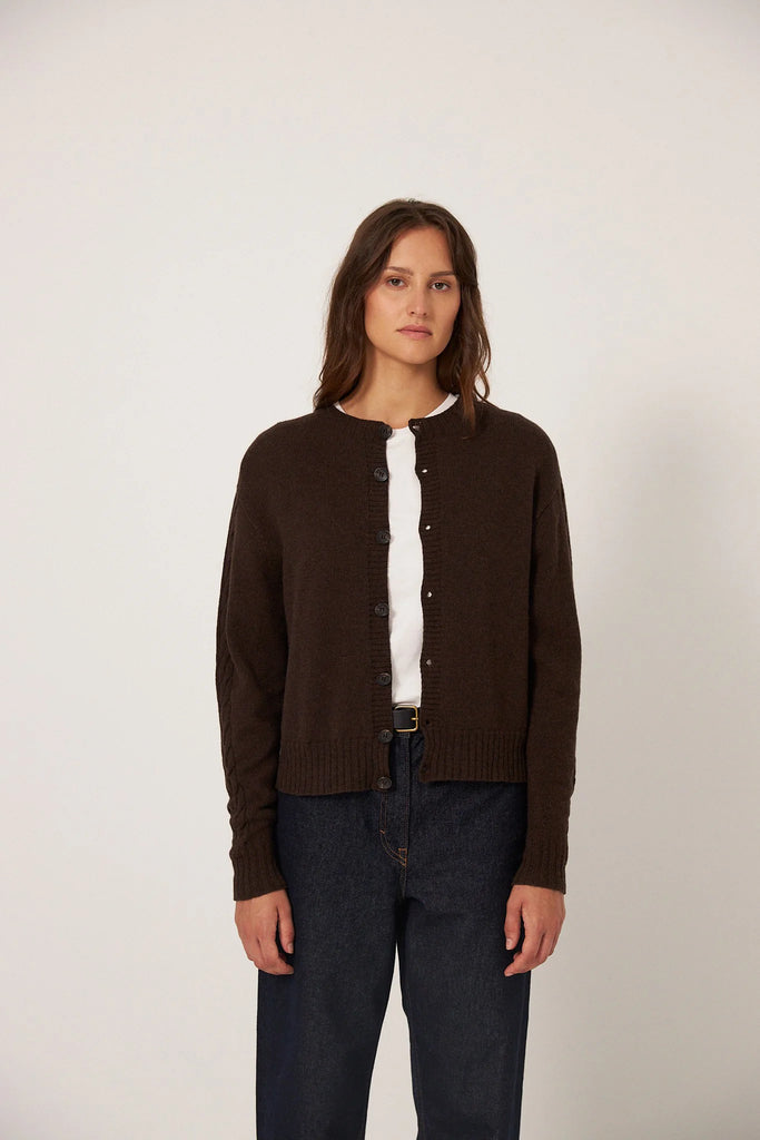 Knitted in our textured merino wool with cables on the sleeve and the back for a touch of nostalgia without the bulk. A locally crafted heirloom, finished with Japanese resin buttons.