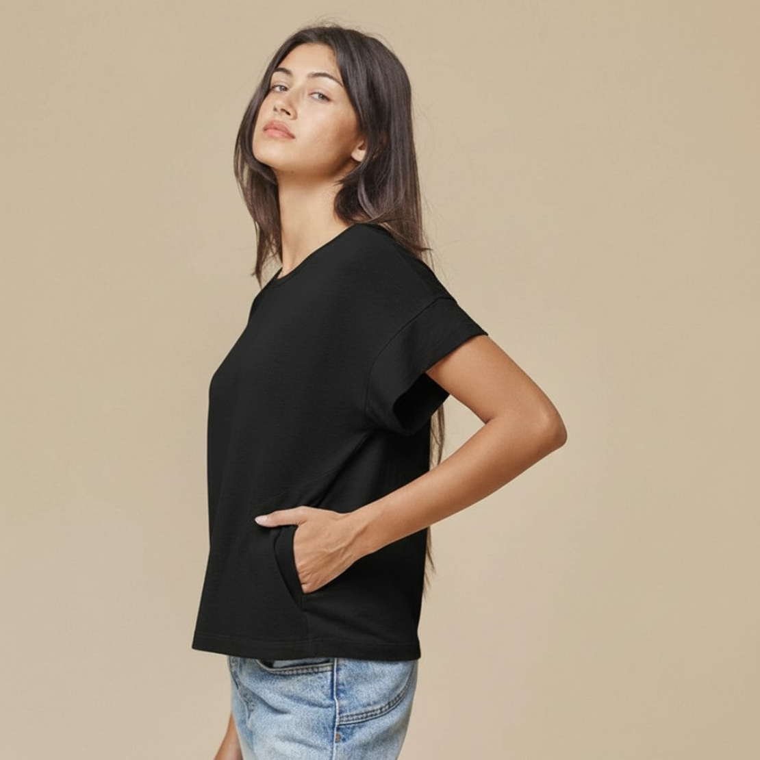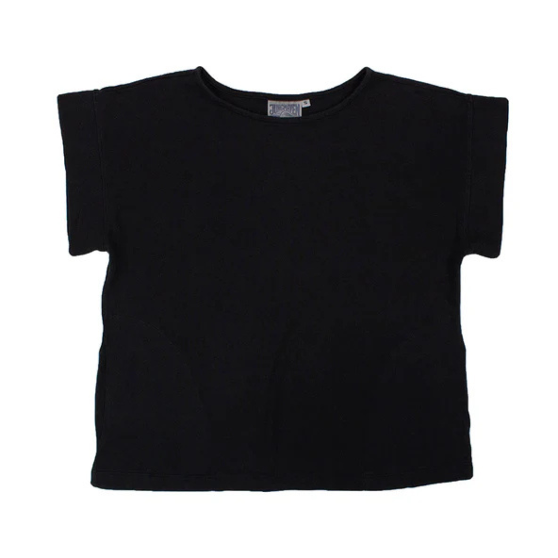 - Boxy/generous fit, subtle boat scooped neck, short sleeve tee